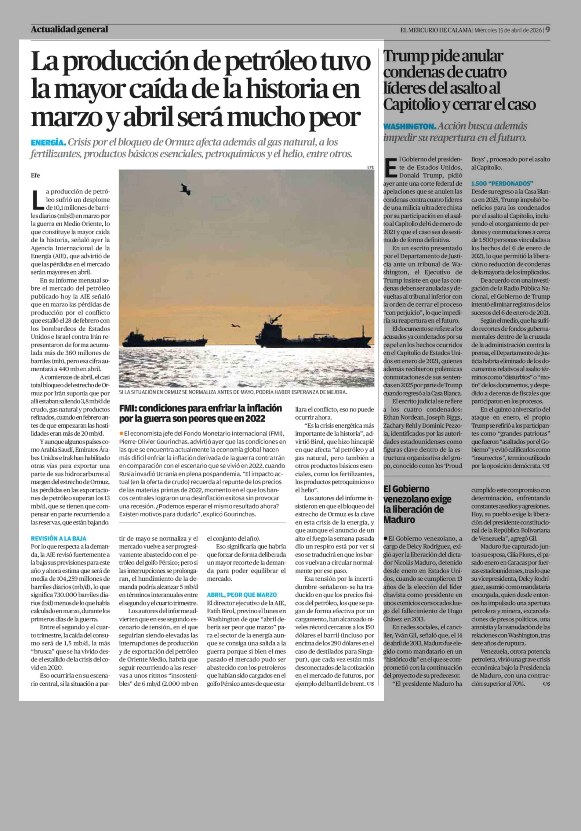 La producción de petróleo tuvo la mayor caída de la historia en marzo y abril será mucho peor 15-04-2026 El Mercurio de Calama |