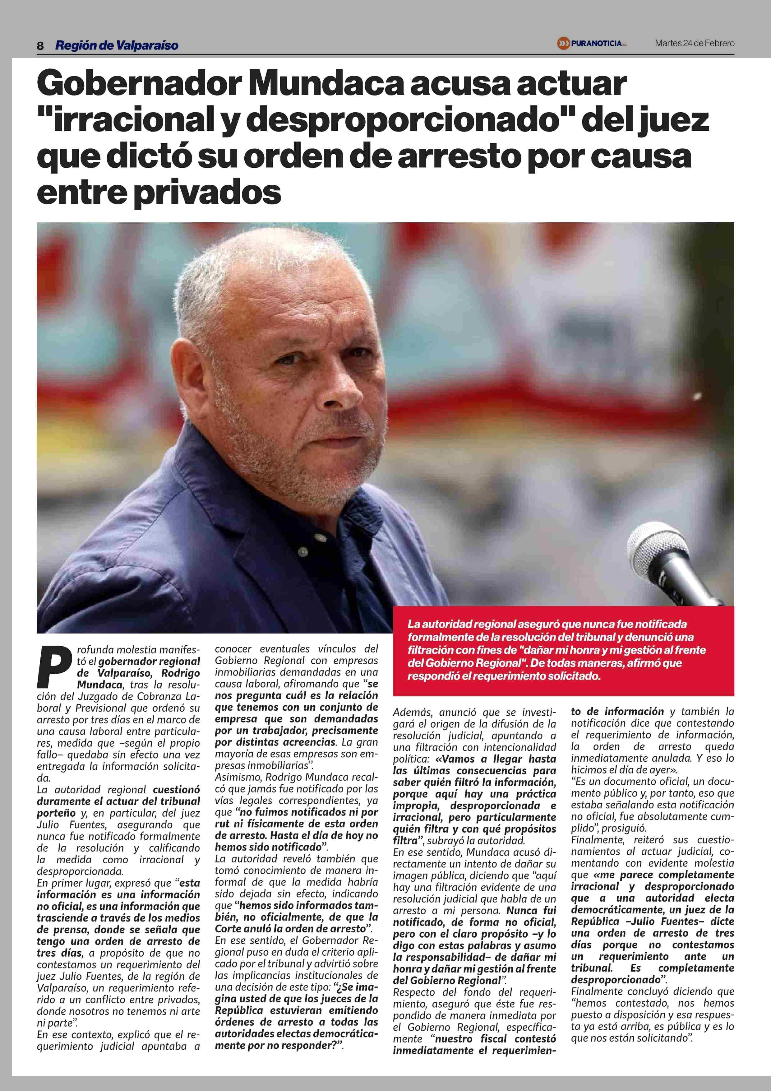 Gobernador Mundaca acusa actuar "irracional y desproporcionado” del juez que dictó su orden de arresto por causa entre privados 24-02-2026 Puranoticia.cl |