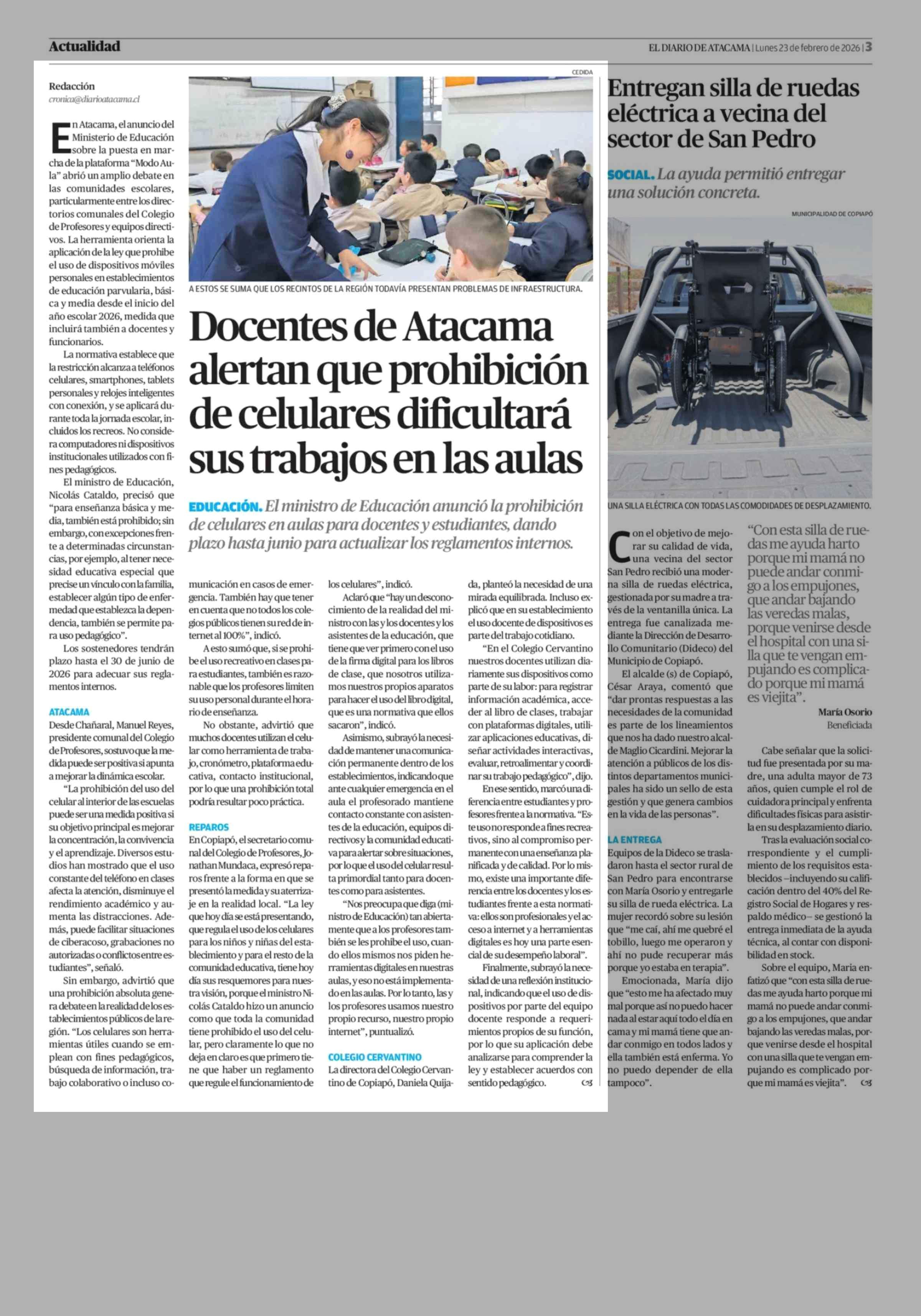 Docentes de Atacama alertan que prohibición de celulares dificultará sus trabajos en las aulas 23-02-2026 El Diario de Atacama |