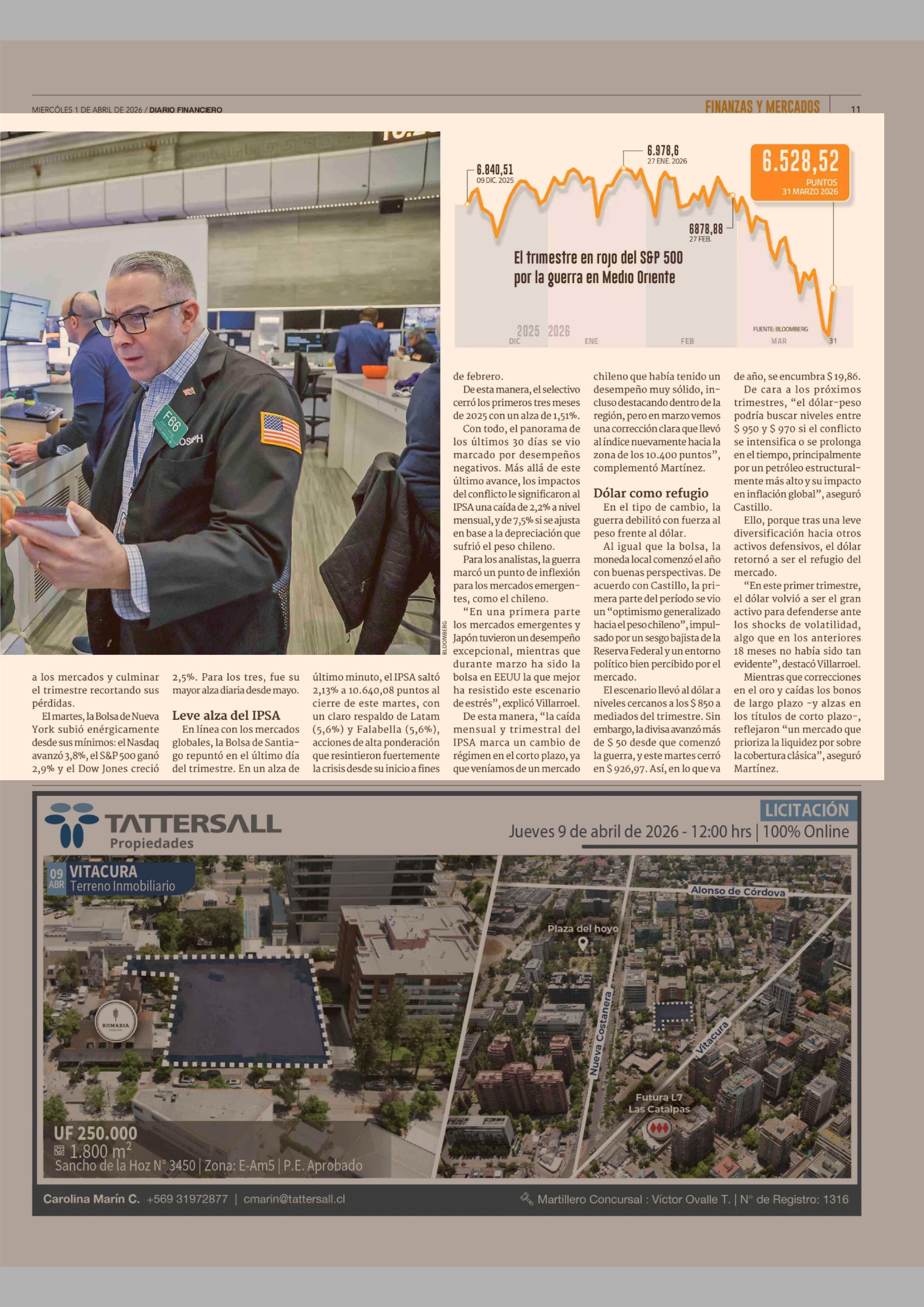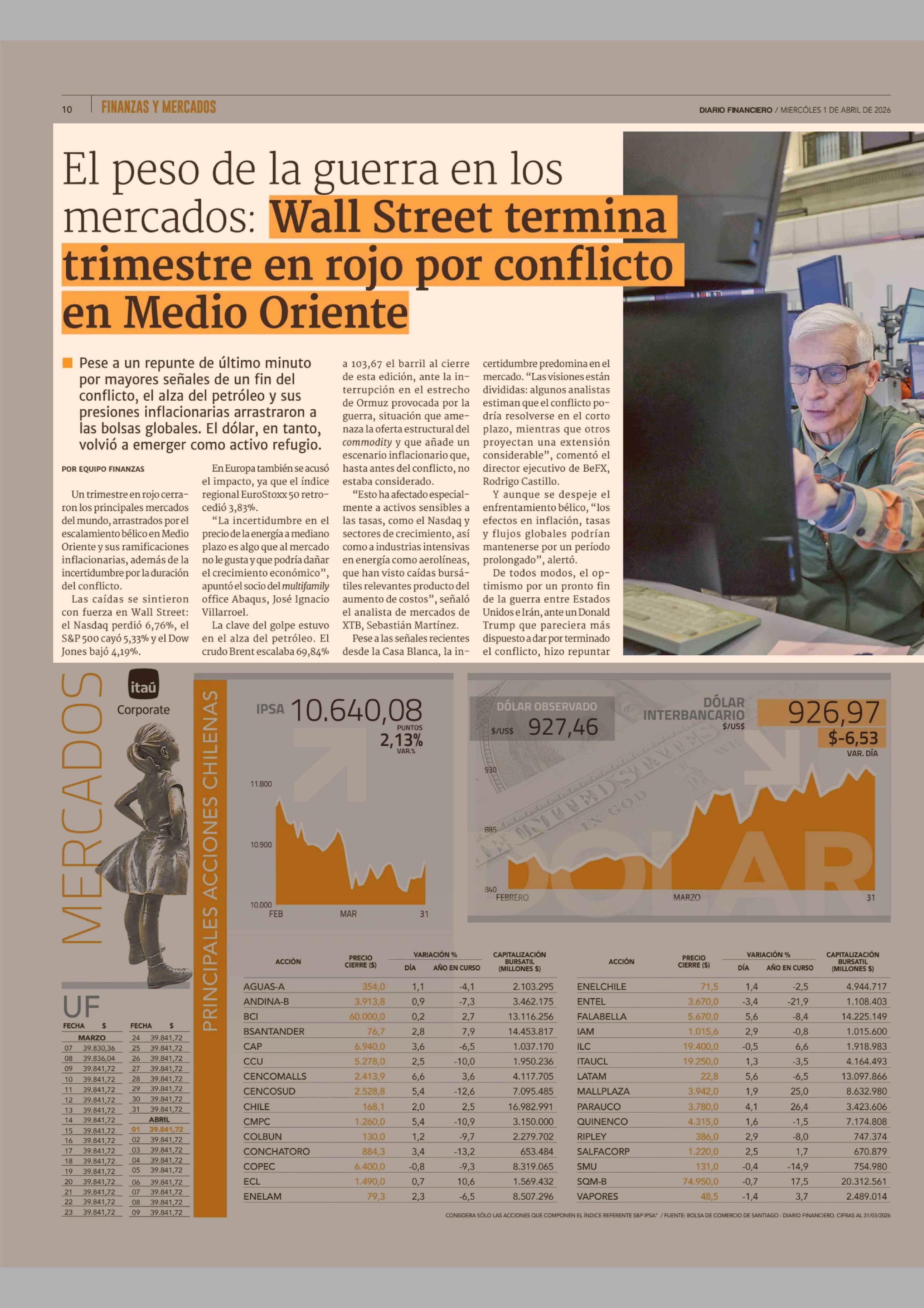 El peso de la guerra en los mercados: Wall Street termina trimestrte en rojo por conflicto en Medio Oriente 01-04-2026 Diario Financiero |