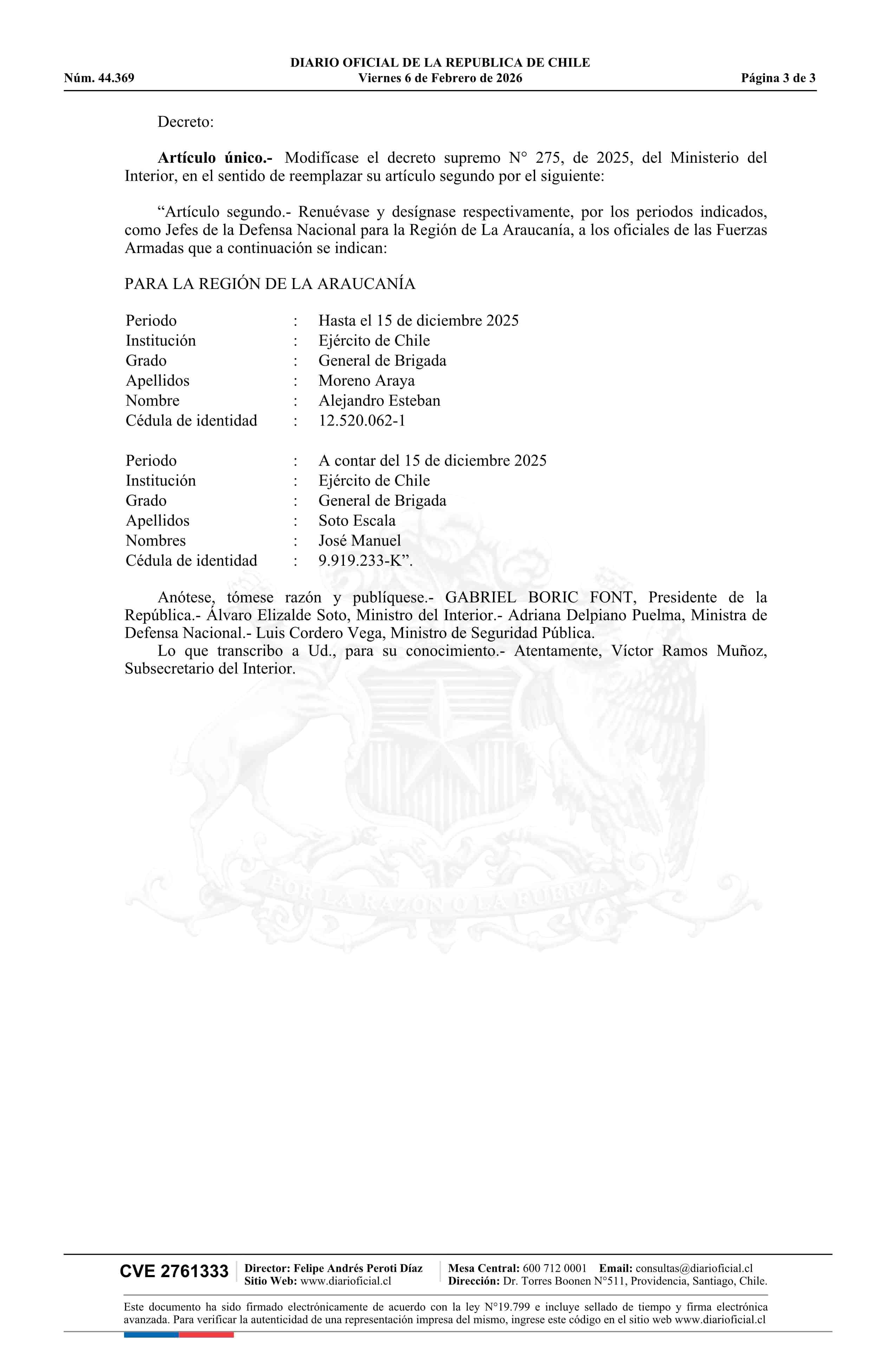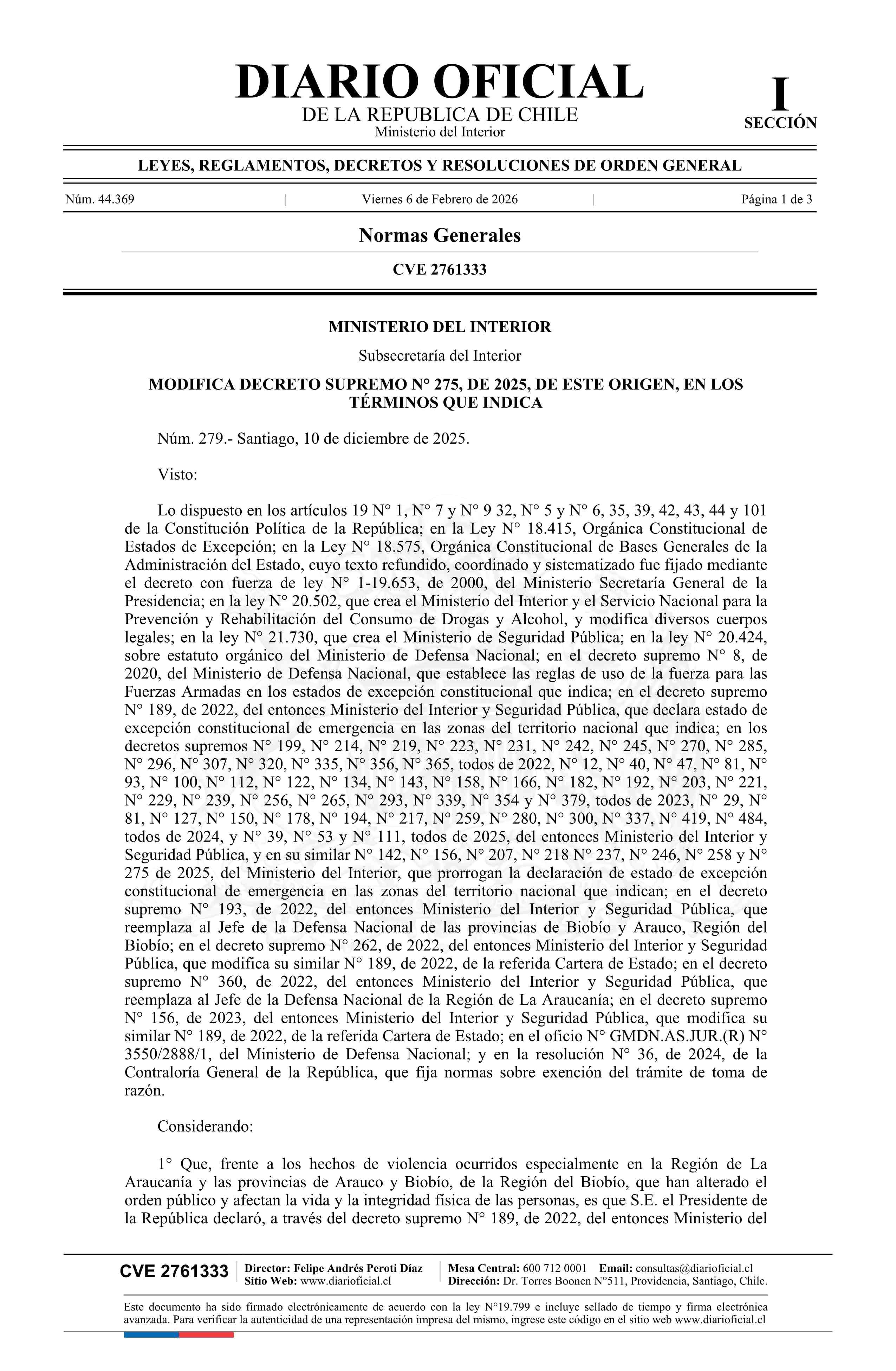 Decreto número 279, de 2025.- Modifica decreto N° 275, de 2025 06-02-2026 Diario Oficial Edición Electrónica |