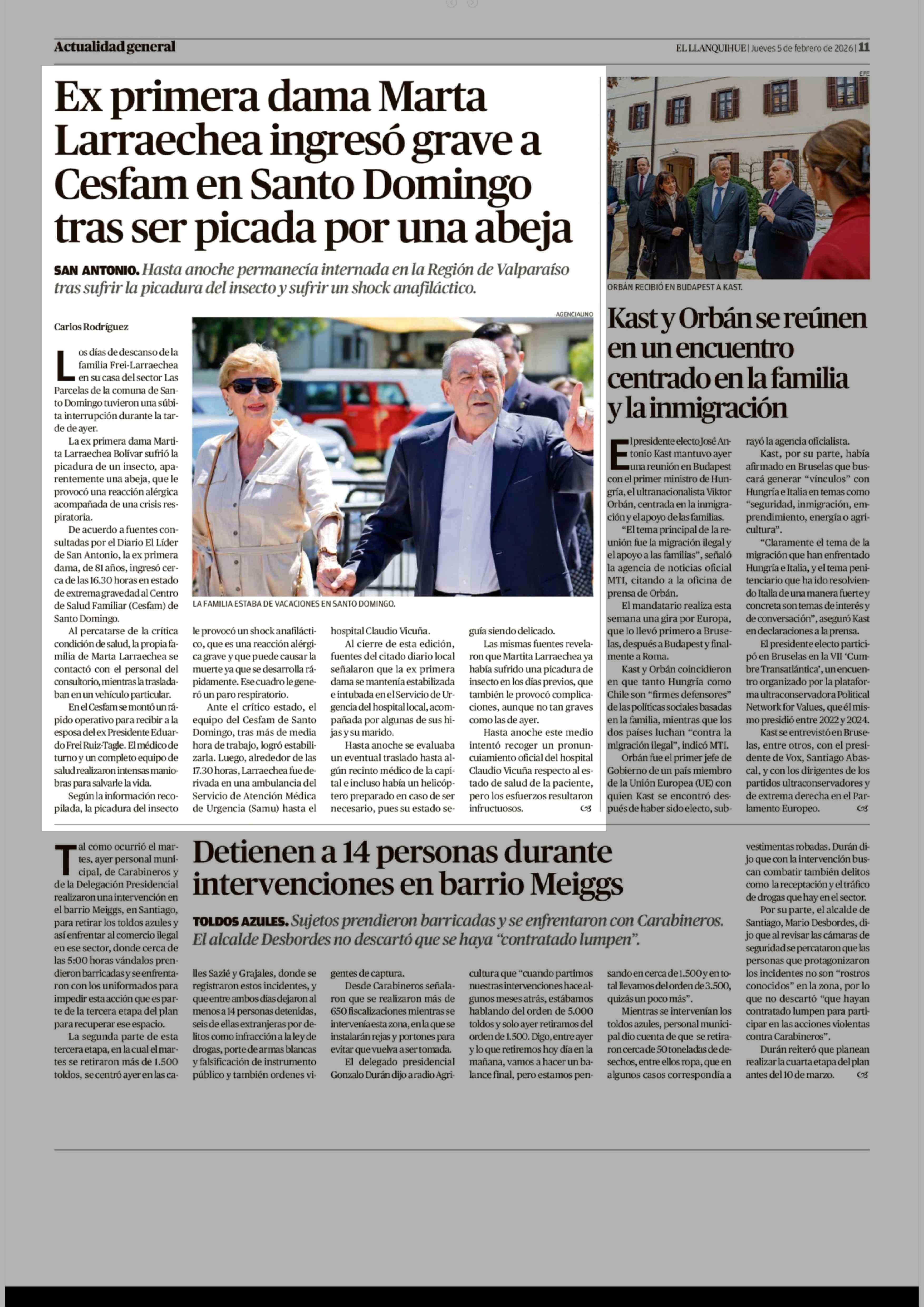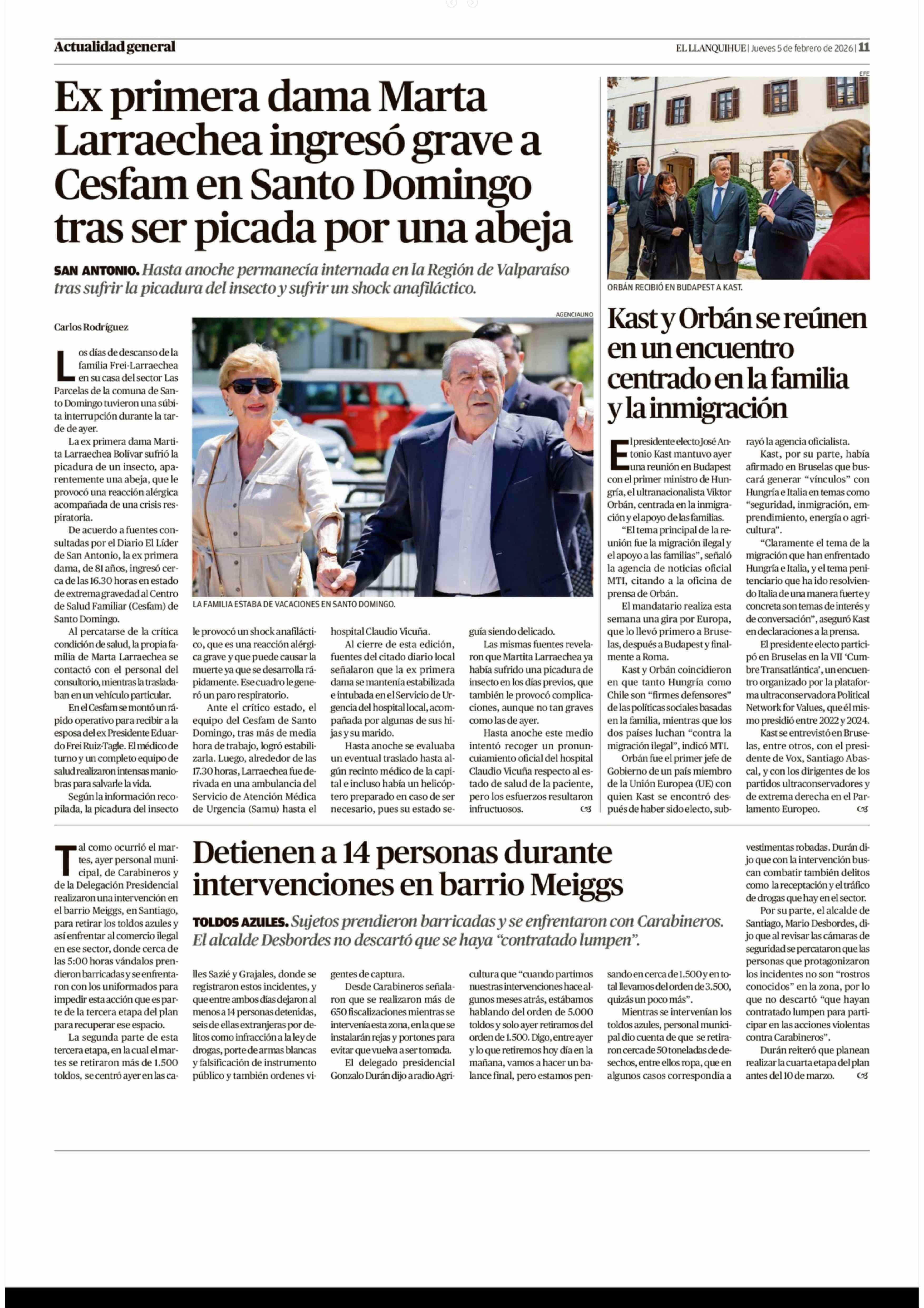 Título: Ex primera dama Marta Larraechea ingresó grave a Cesfam en Santo Domingo tras ser picada por una abeja