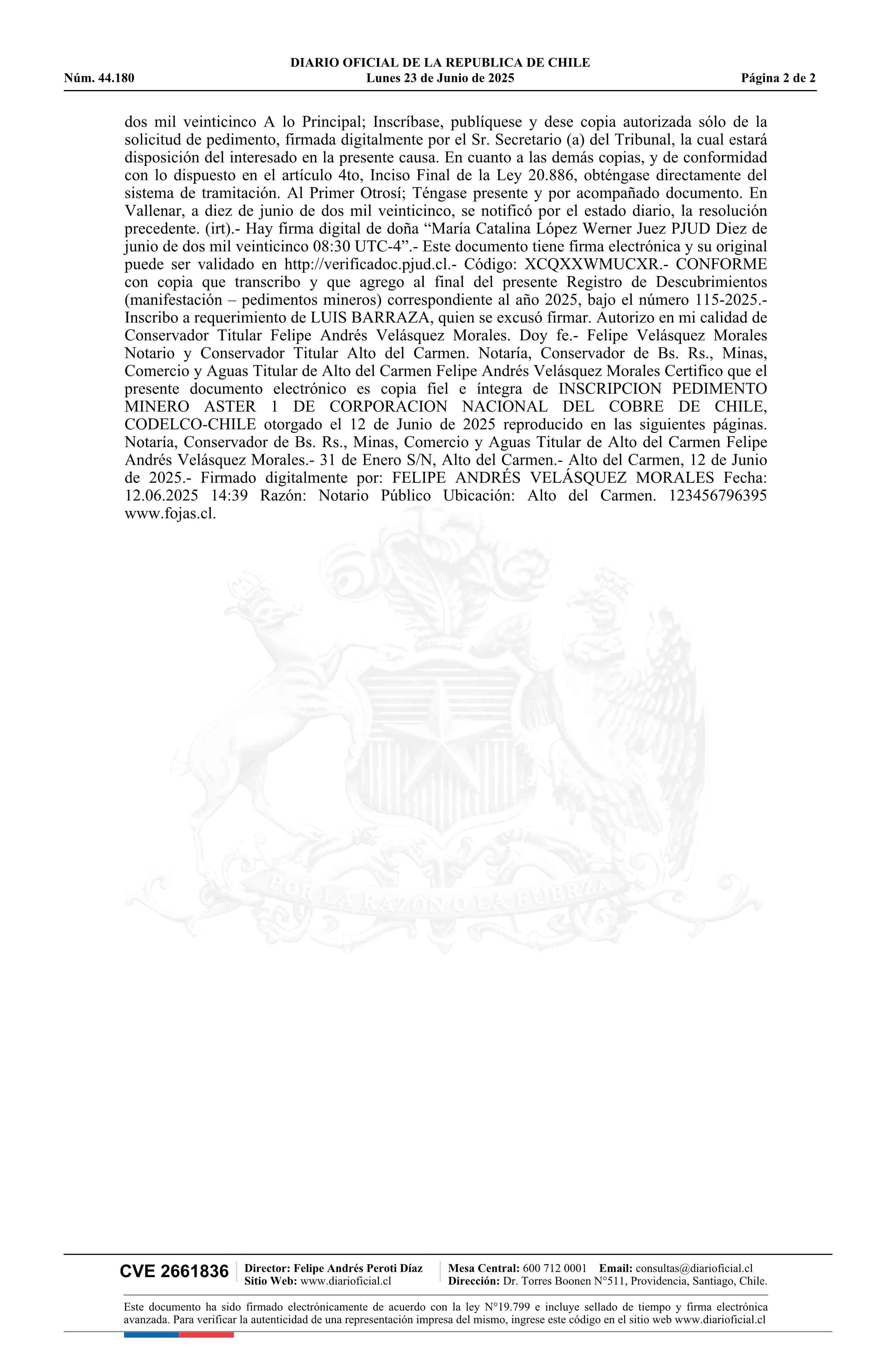 ASTER 1 / Corporación Nacional del Cobre de Chile 23-06-2025 DIARIO OFICIAL CHILE - BOLETÍN OFICIAL DE MINERÍA |