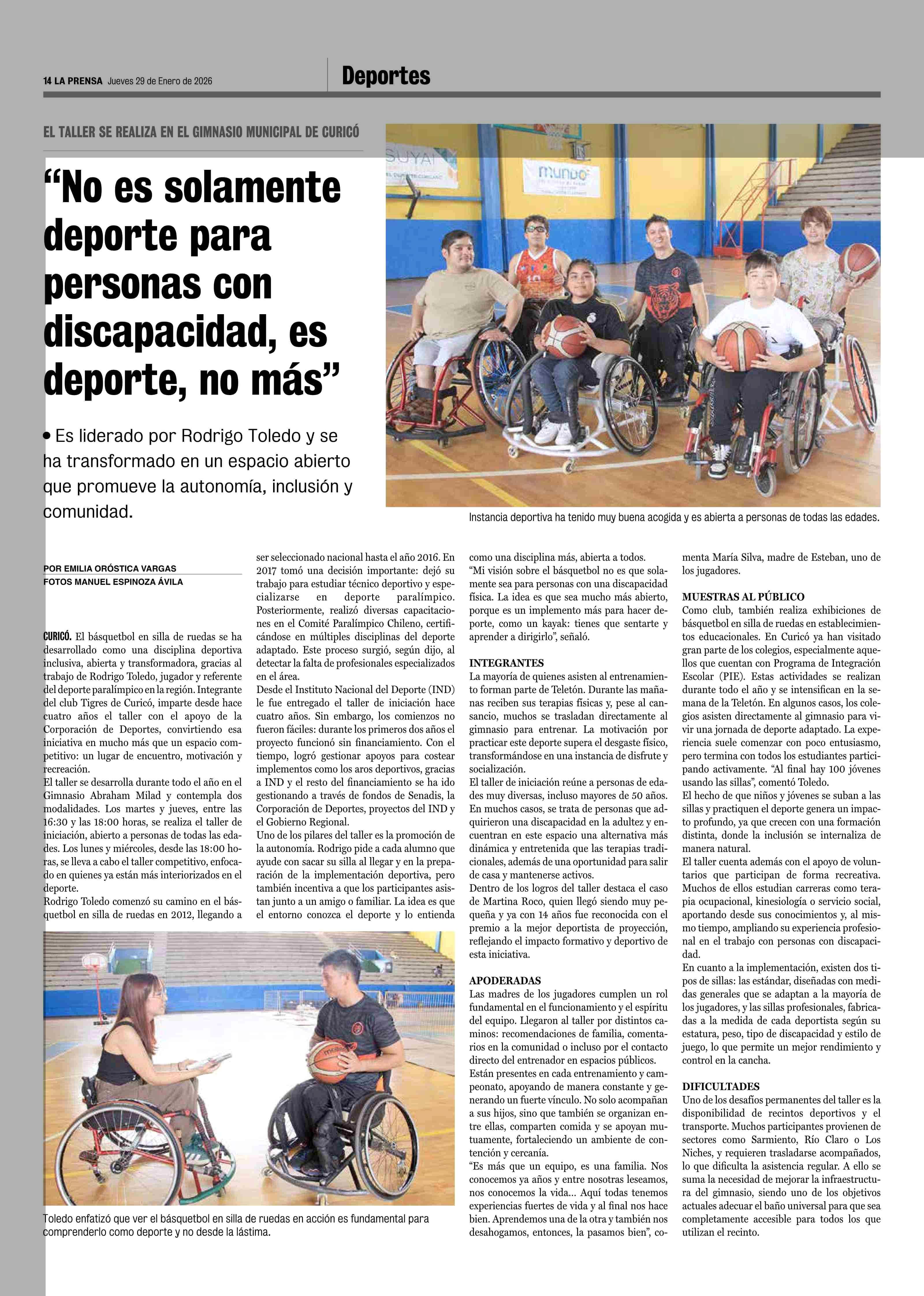 "No es solamente deporte para personas con discapacidad, es deporte, no más" 29-01-2026 La Prensa de Curicó |