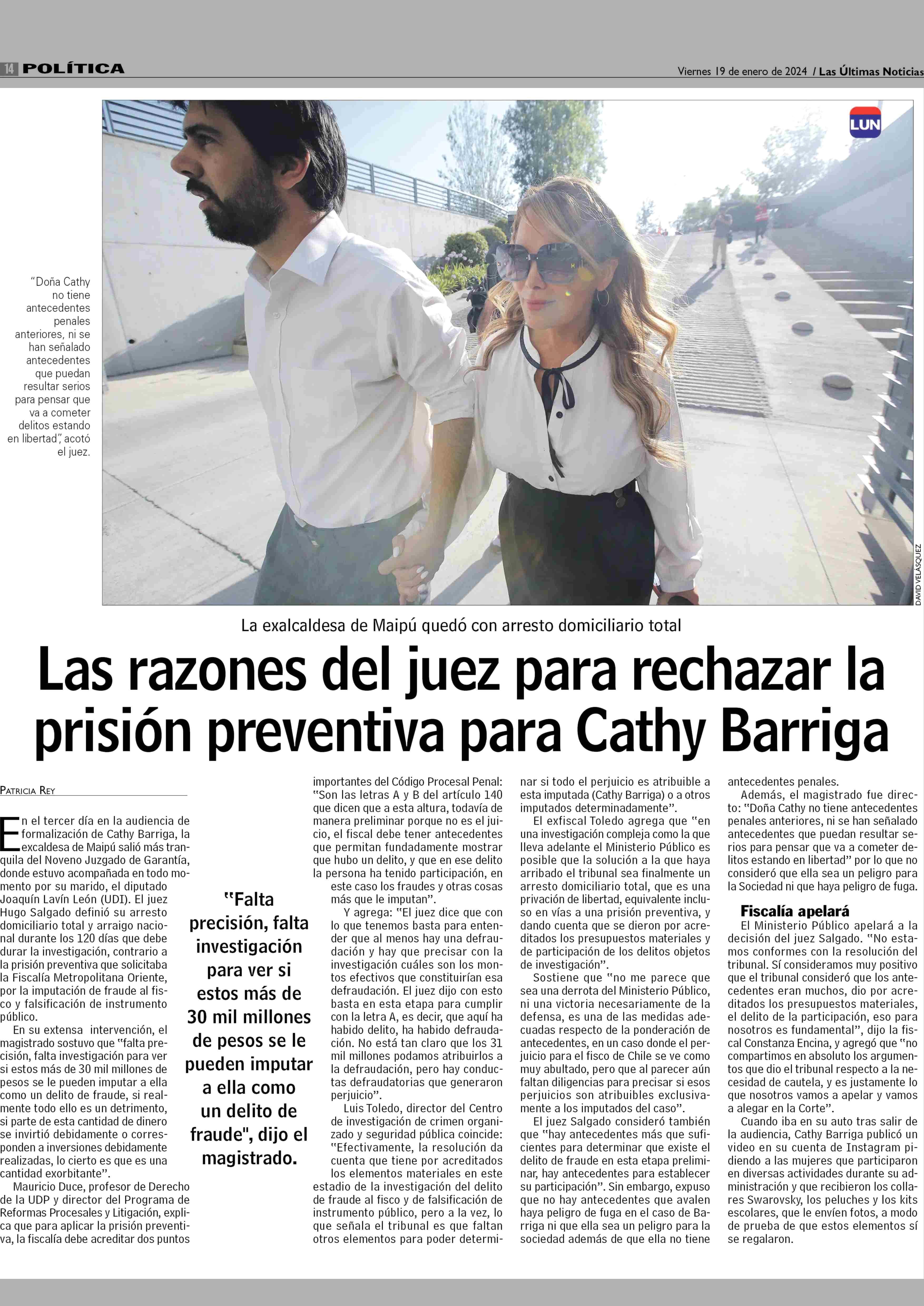 Las razones del juez para rechazar la prisión preventiva para Cathy Barriga 19-01-2024 Las Últimas Noticias |