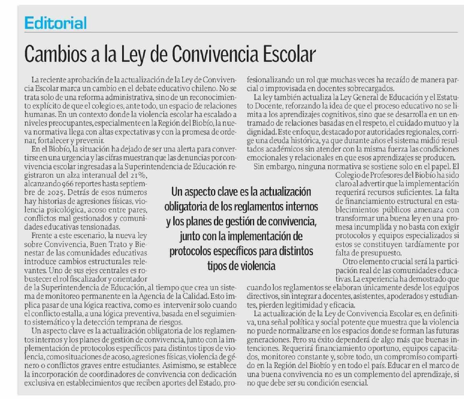 EDITORIAL: Cambios a la Ley de Convivencia Escolar 17-02-2026 El Sur |