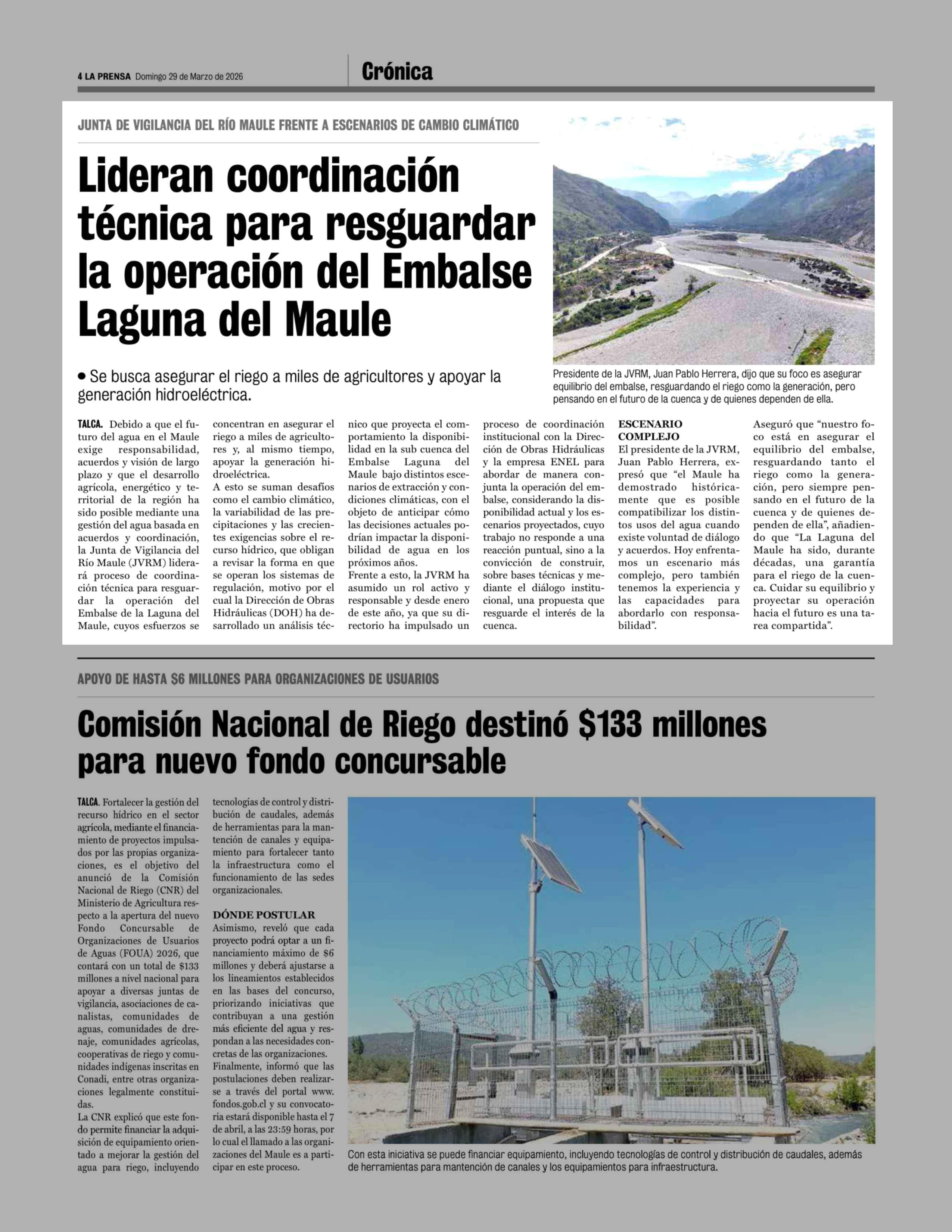 Lideran coordinación técnica para resguardar la operación del Embalse Laguna del Maule 29-03-2026 La Prensa de Curicó |