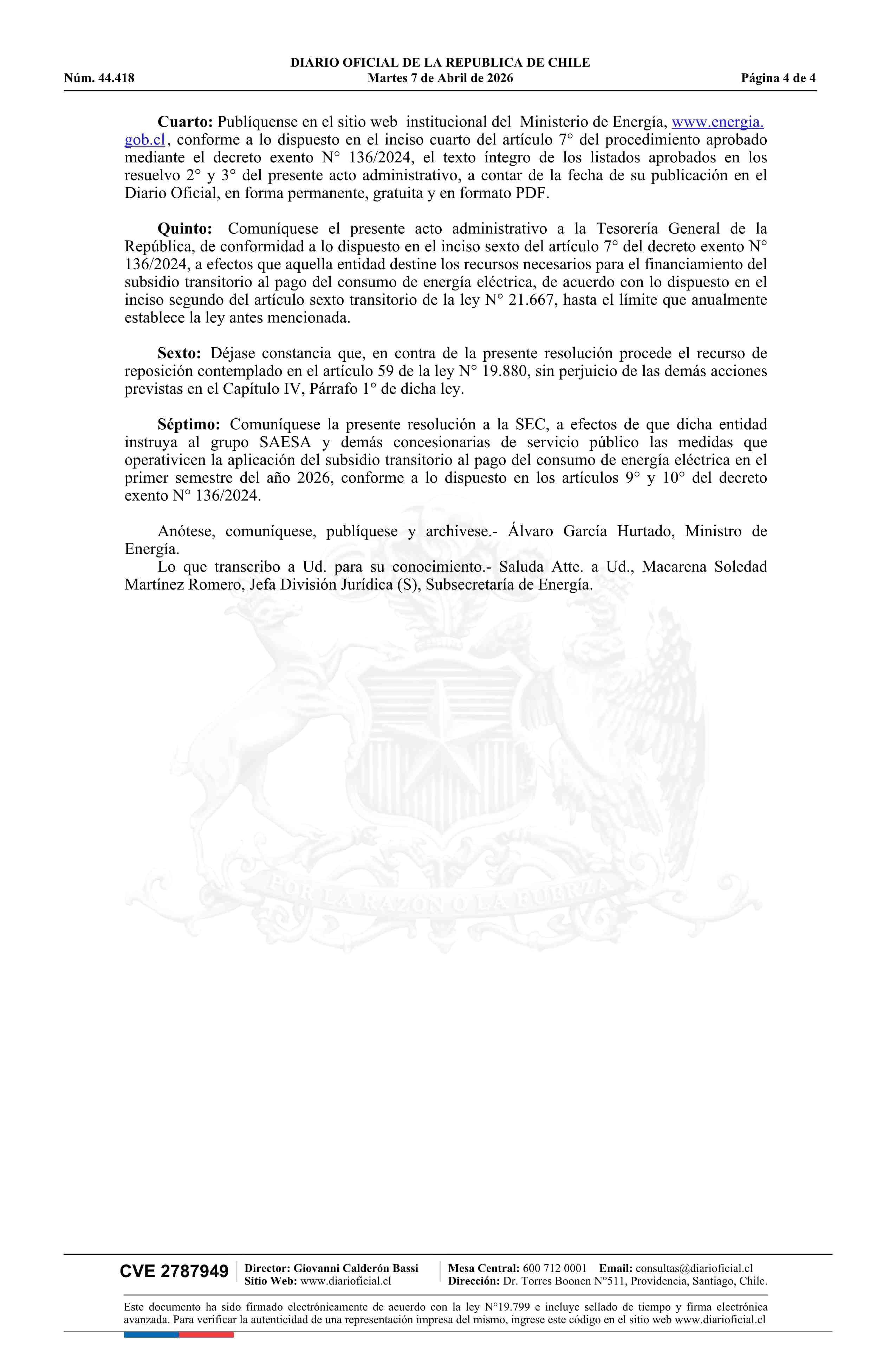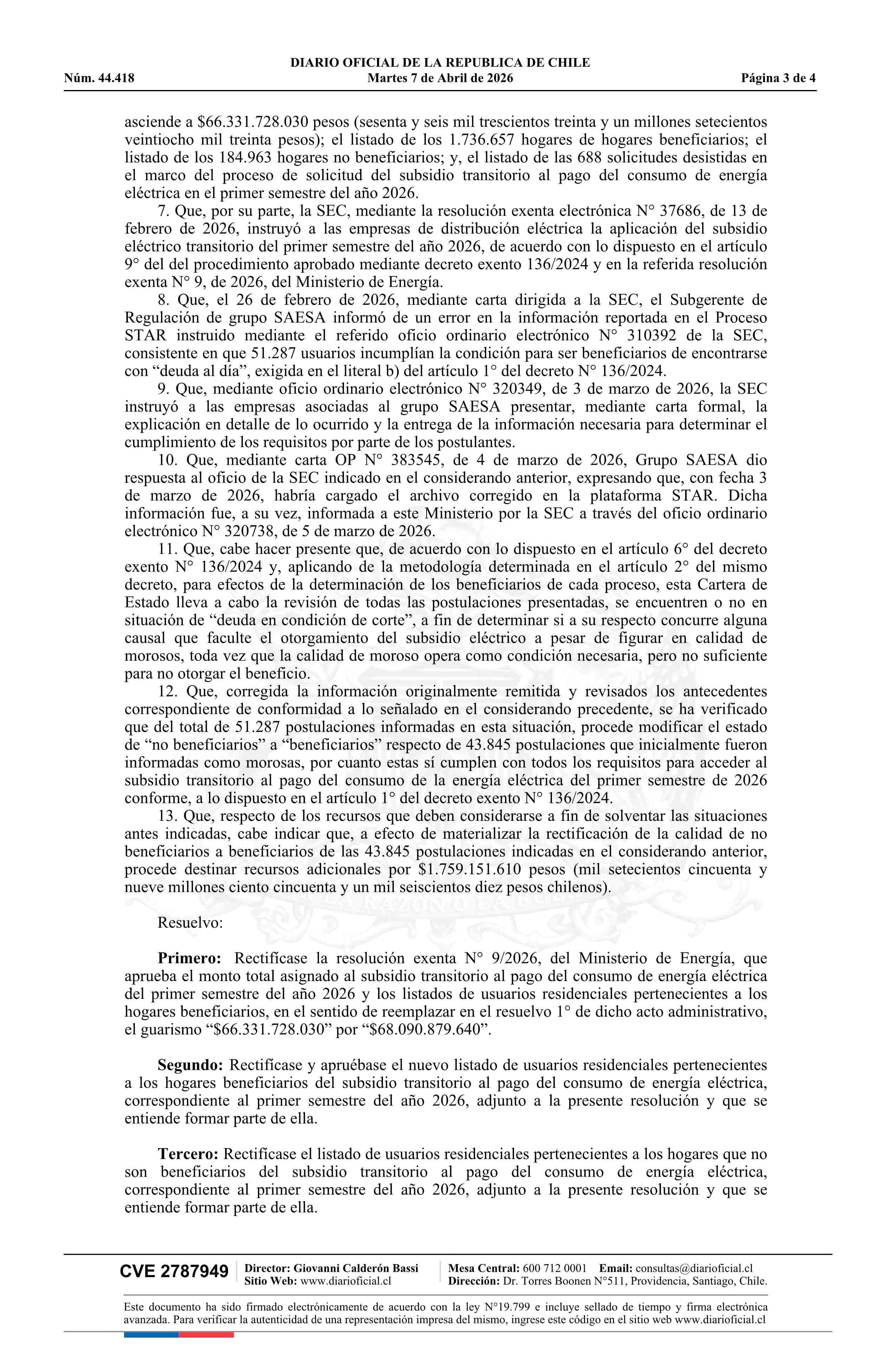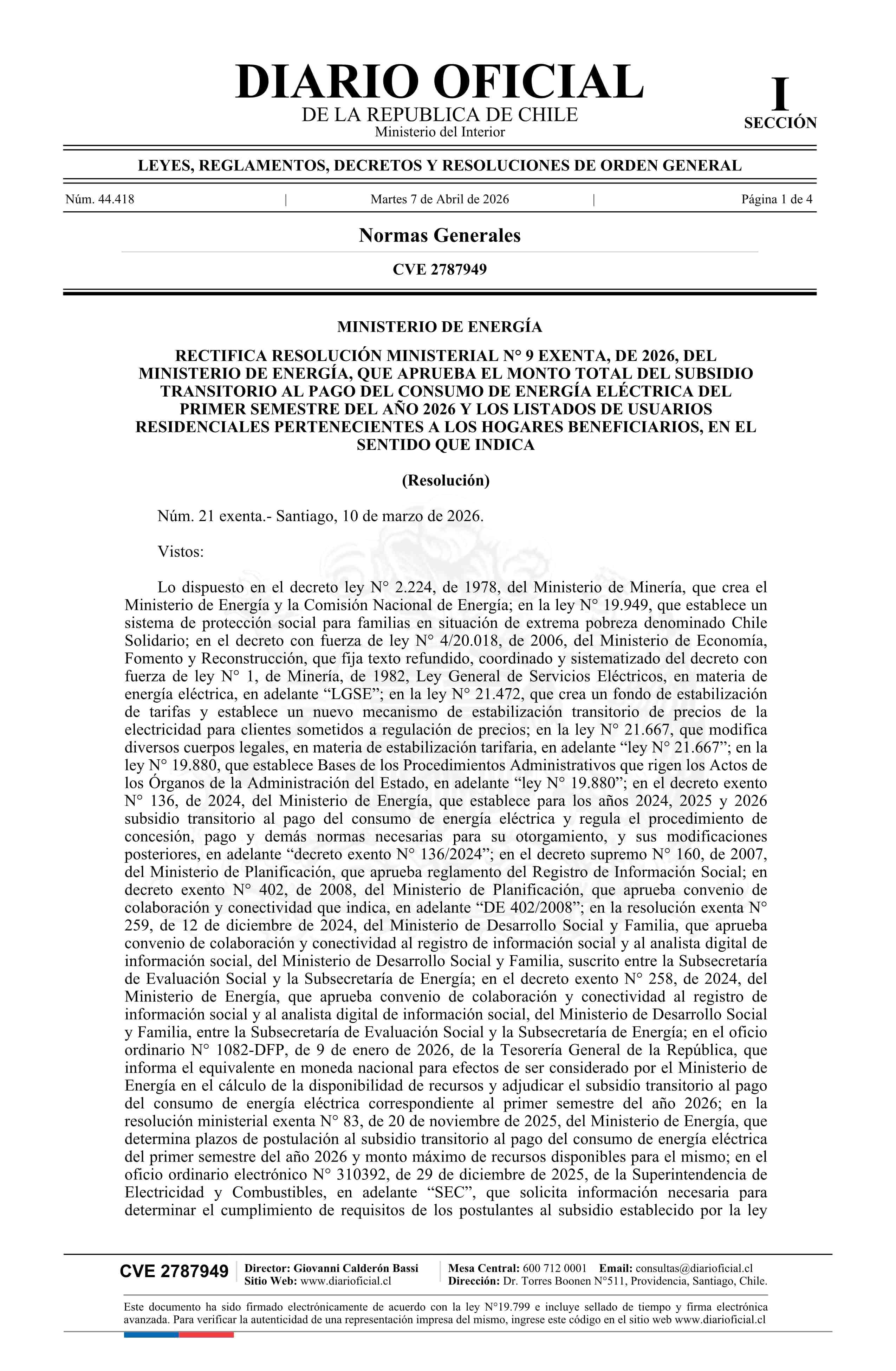 | Título: | Resolución exenta número 21, de 2026.- Rectifica resolución N° 9 exenta, de 2026, que aprueba el monto total del subsidio transitorio al pago del consumo de energía eléctrica del primer semestre del año 2026 y los listados de usuarios residenciales pertenecientes a los hogares beneficiarios |