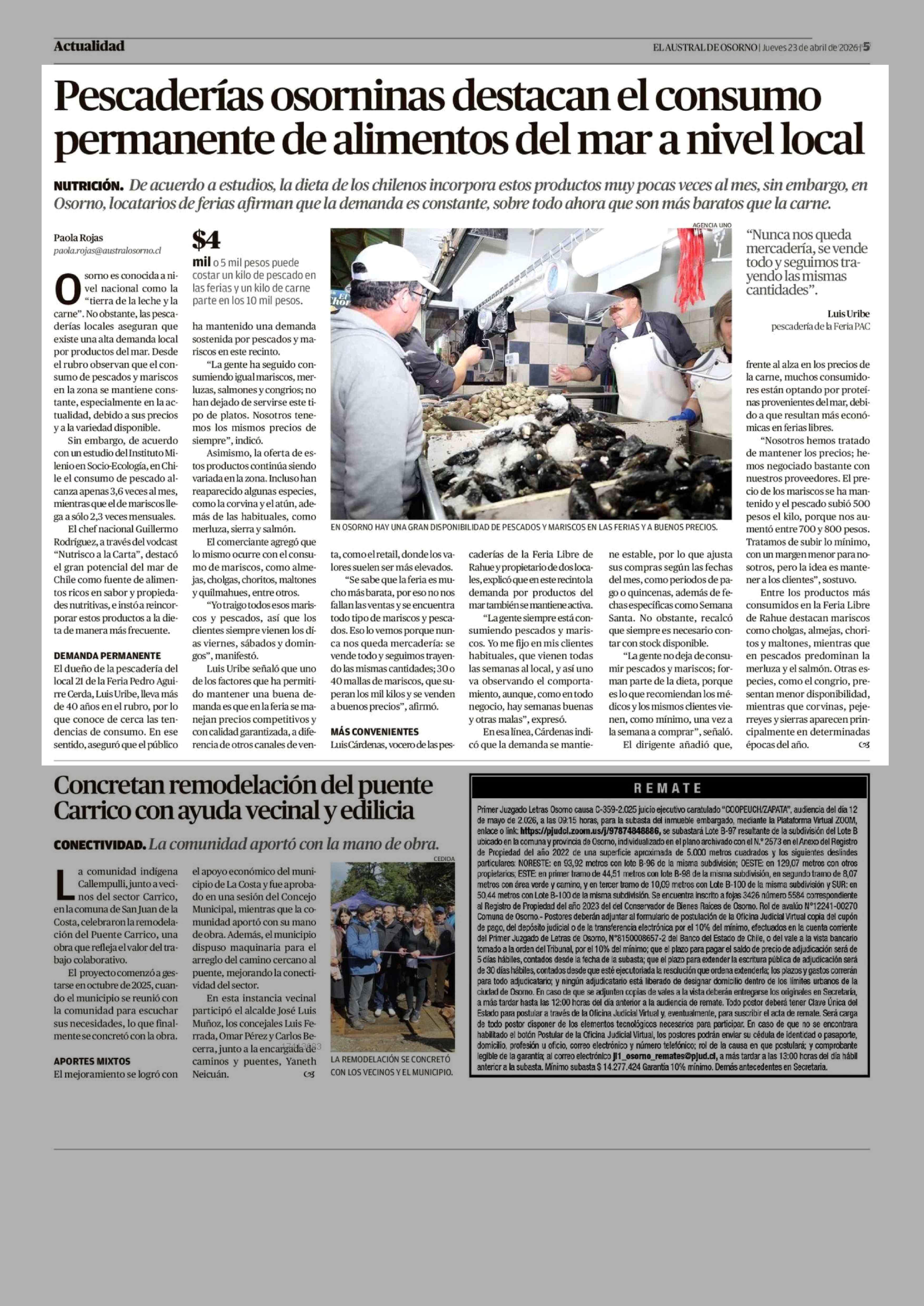 Pescaderías osorninas destacan el consumo permanente de alimentos del mar a nivel local 23-04-2026 El Austral de Osorno |