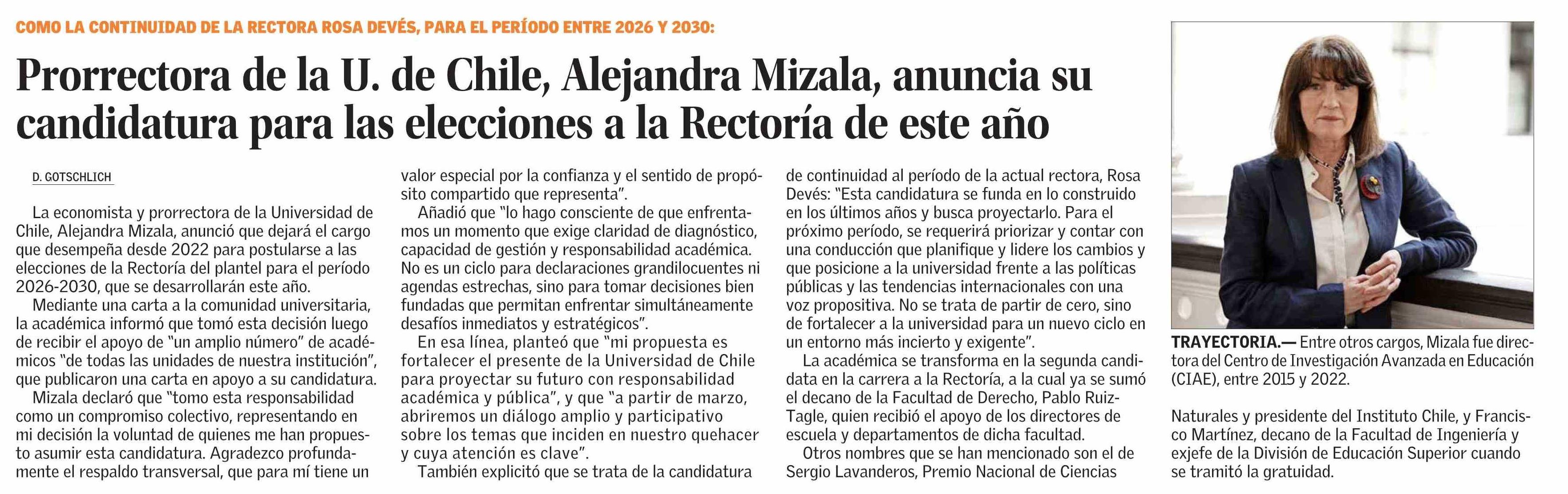 Prorrectora de la U. de Chile, Alejandra Mizala, anuncia su candidatura para las elecciones a la Rectoría de este año 04-03-2026 El Mercurio |