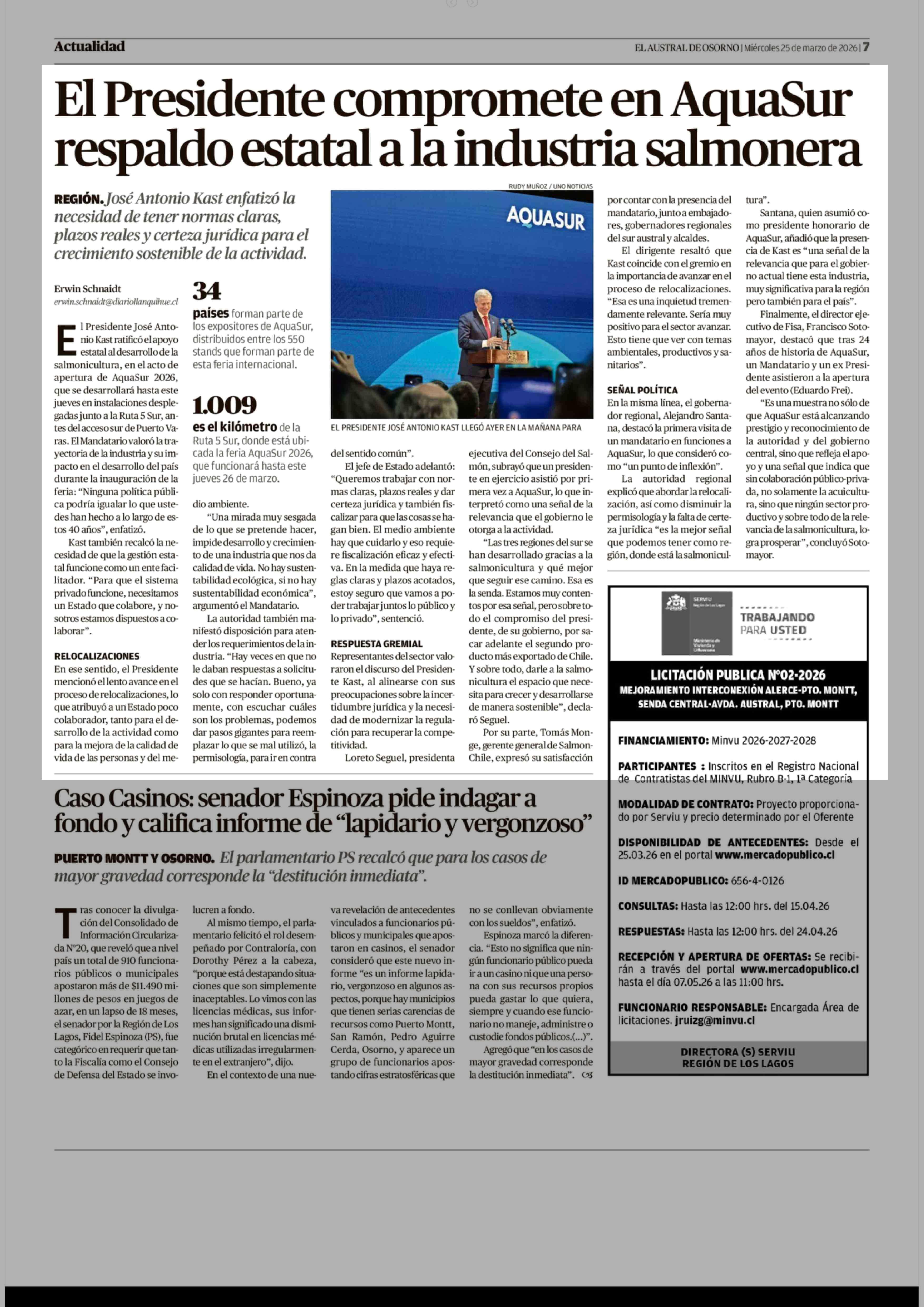 El Presidente compromete en AquaSur respaldo estatal a la industria salmonera 25-03-2026 El Austral de Osorno |