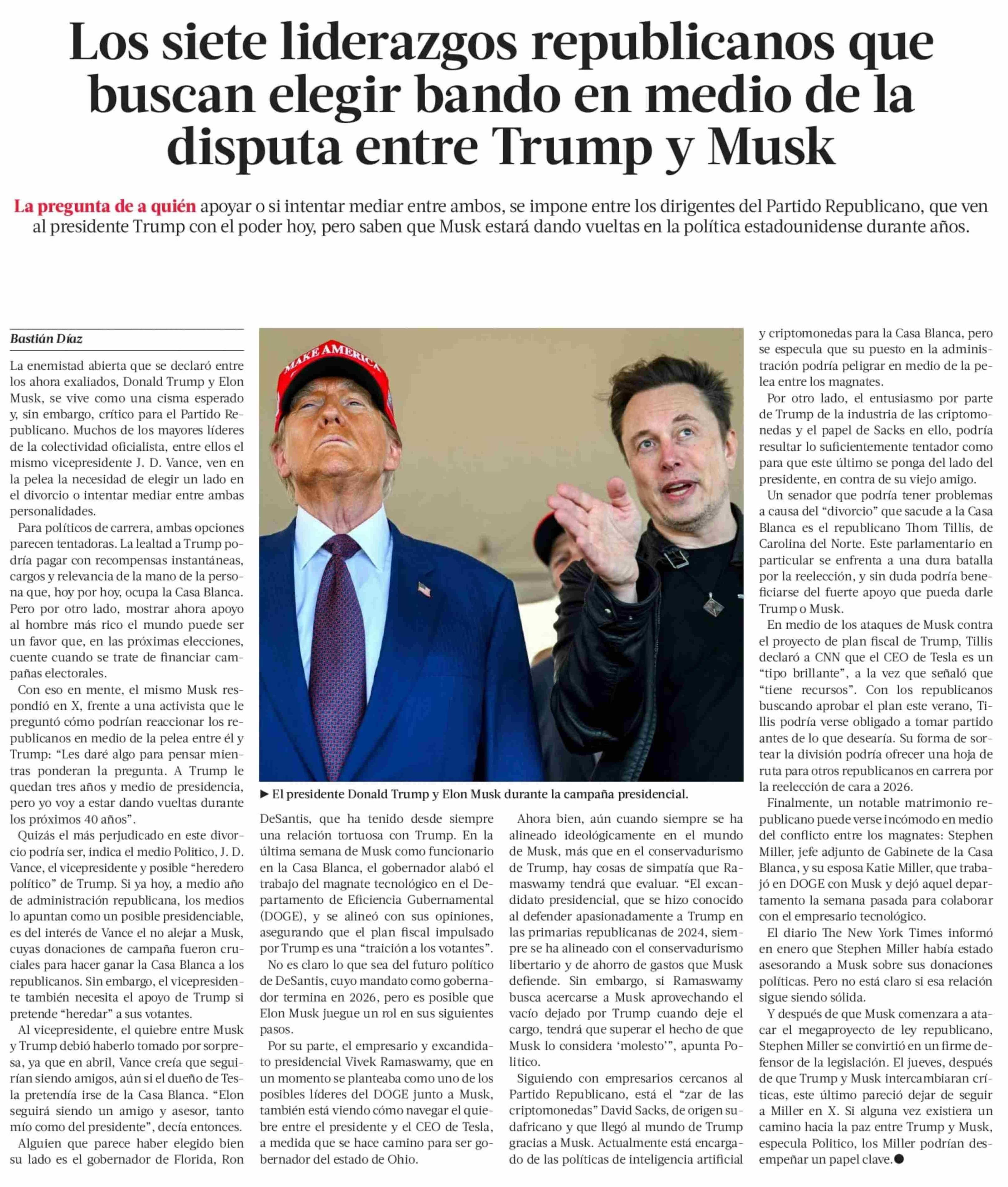 Los siete liderazgos republicanos que buscan elegir bando en medio de la disputa entre Trump y Musk 10-06-2025 La Tercera |