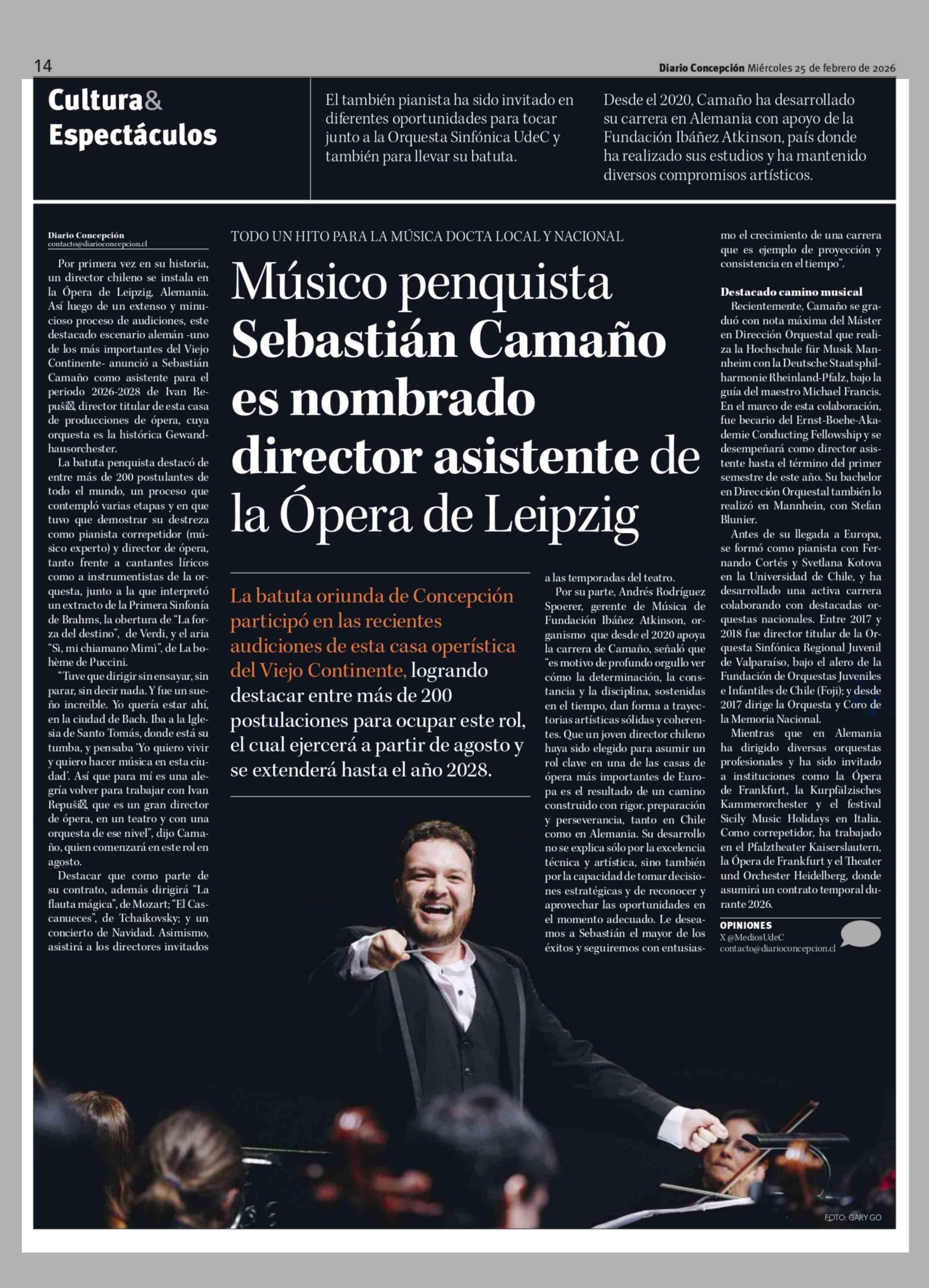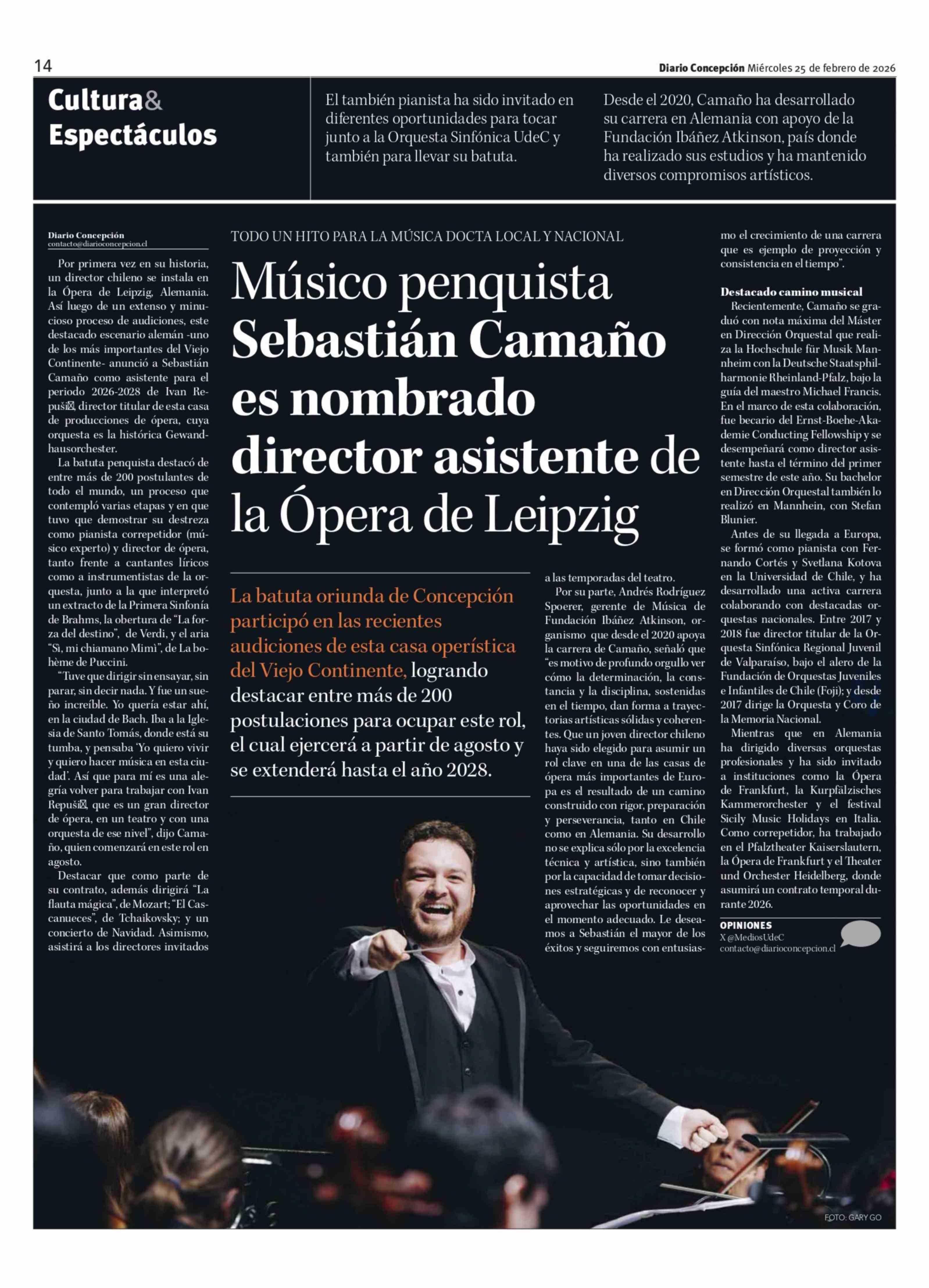 Músico penquista Sebastián Camaño es nombrado director asistente de la Ópera de Leipzig 25-02-2026 Diario Concepción |