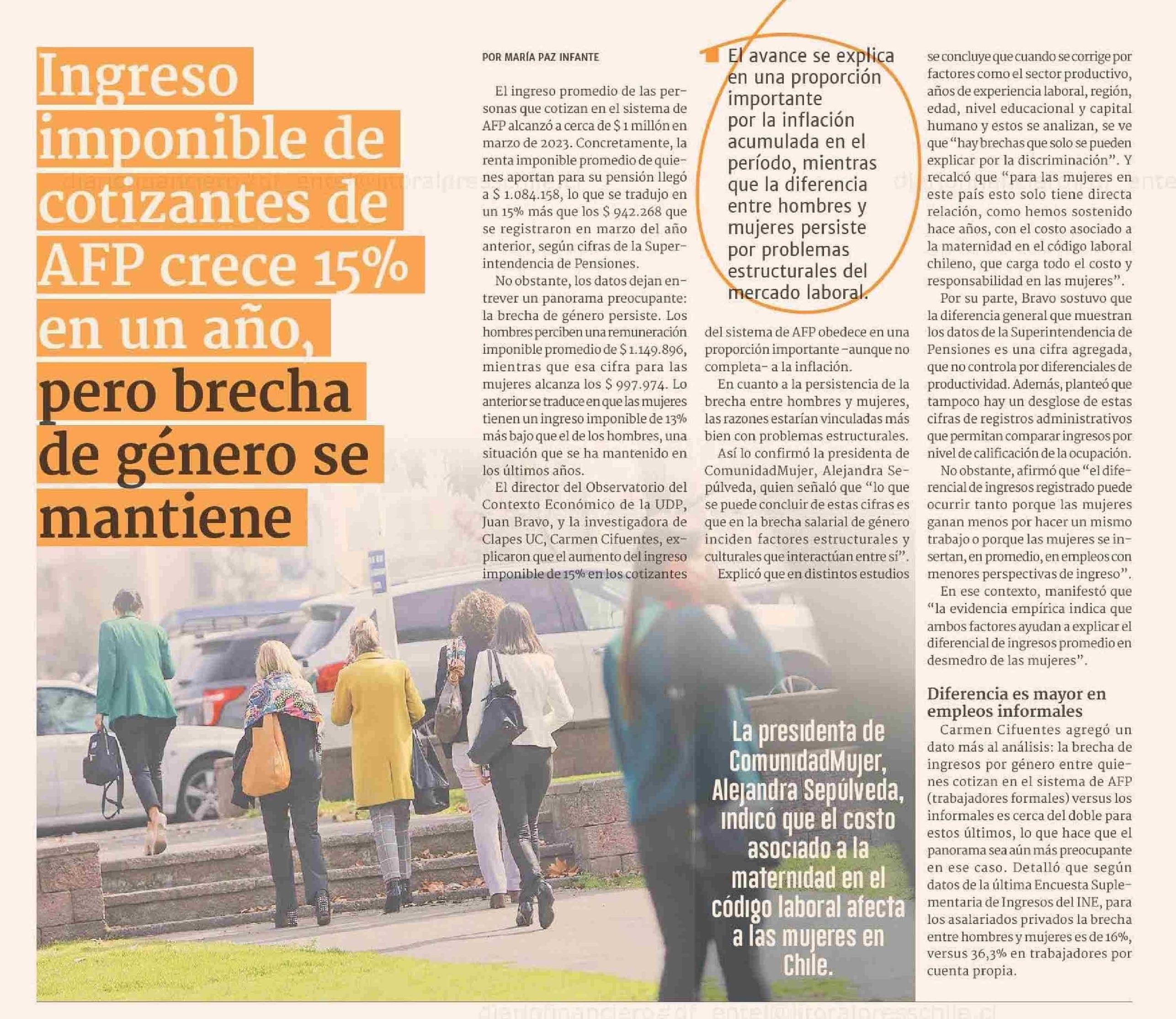 Ingreso imponible de cotizantes de AFP crece 15% en un año, pero brecha de género se mantiene 17-05-2023 Diario Financiero |