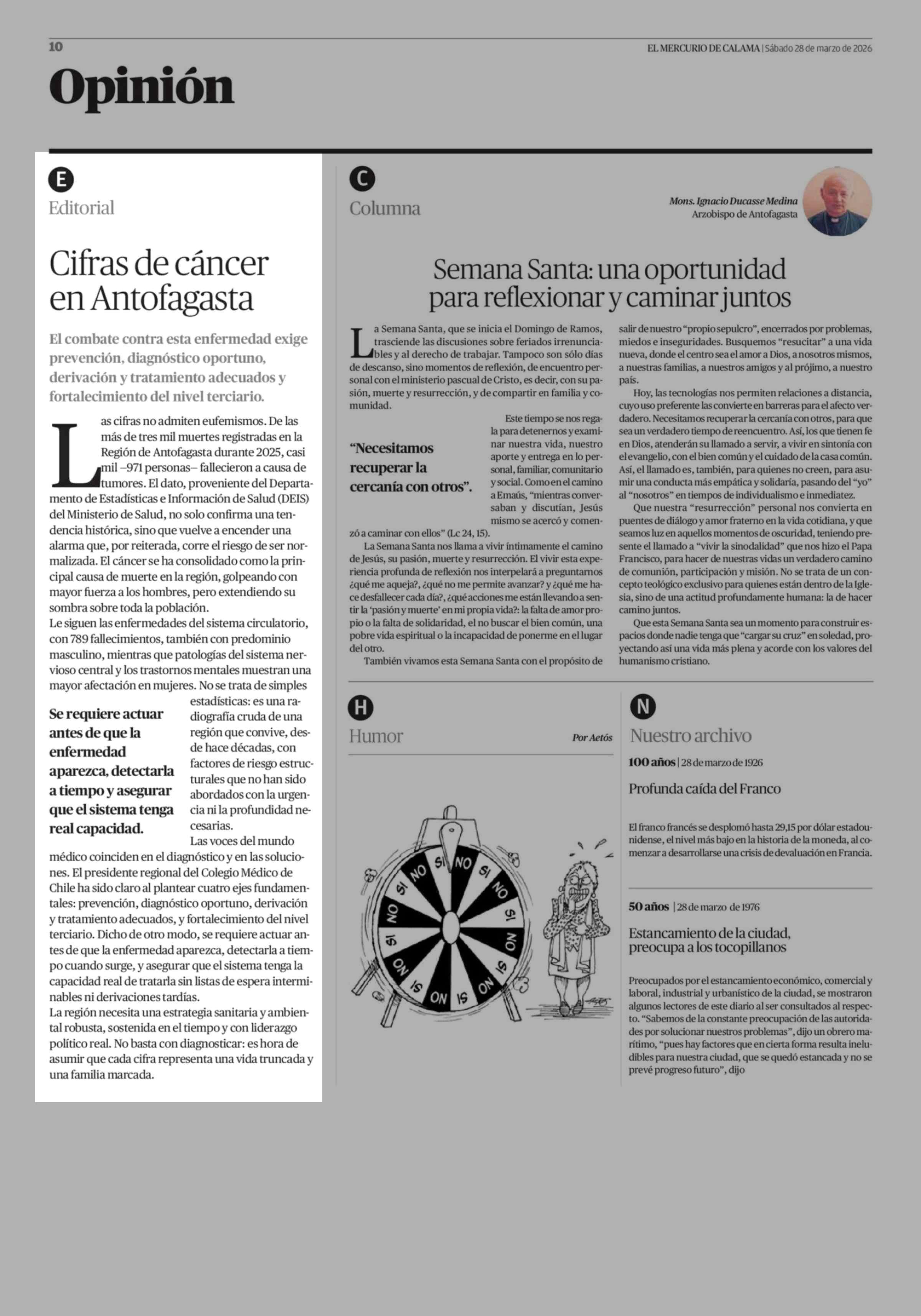 Editorial: Cifras de cáncer en Antofagasta 28-03-2026 El Mercurio de Calama |