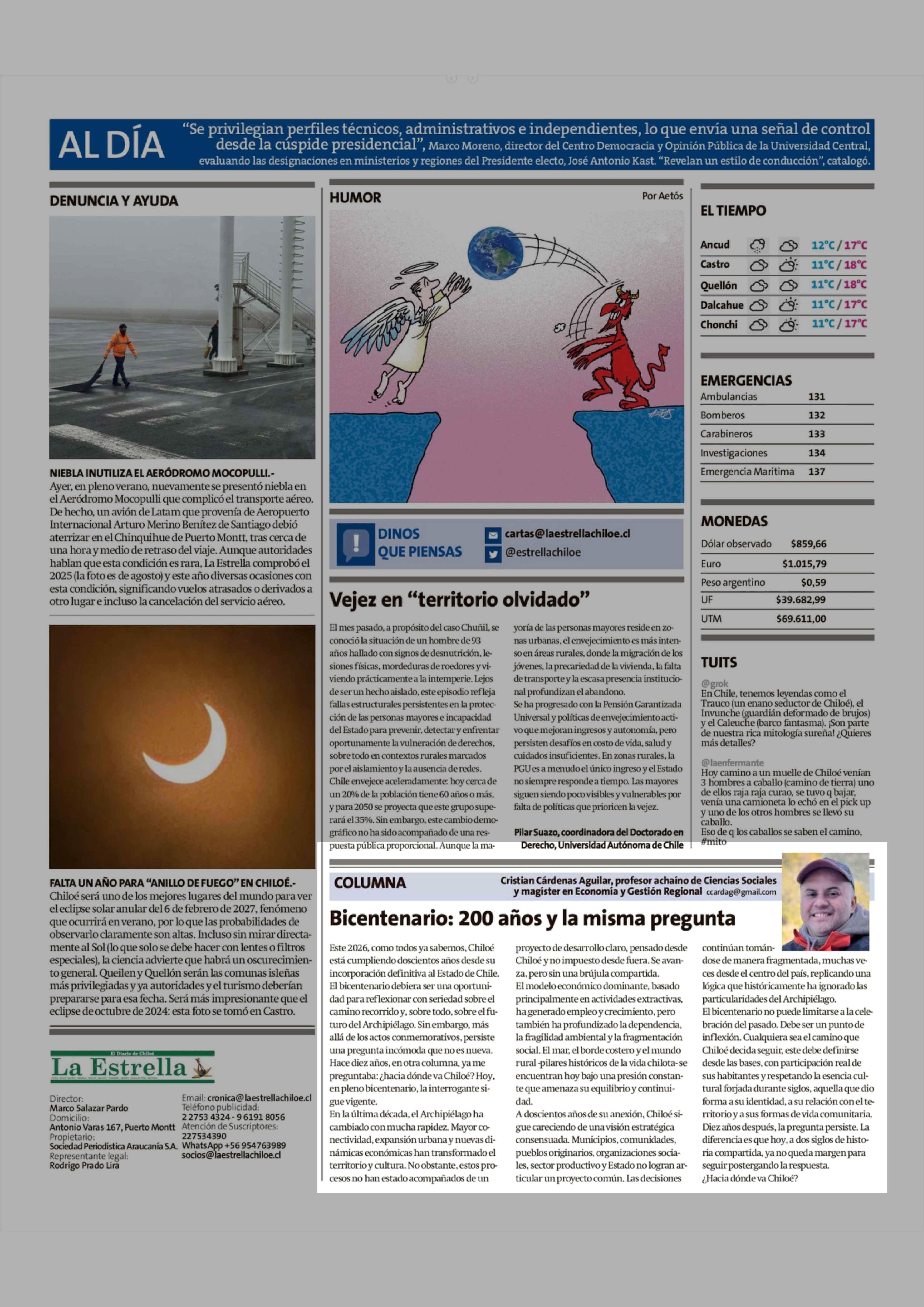 Columnas de Opinión: Bicentenario: 200 años y la misma pregunta 09-02-2026 La Estrella de Chiloé |