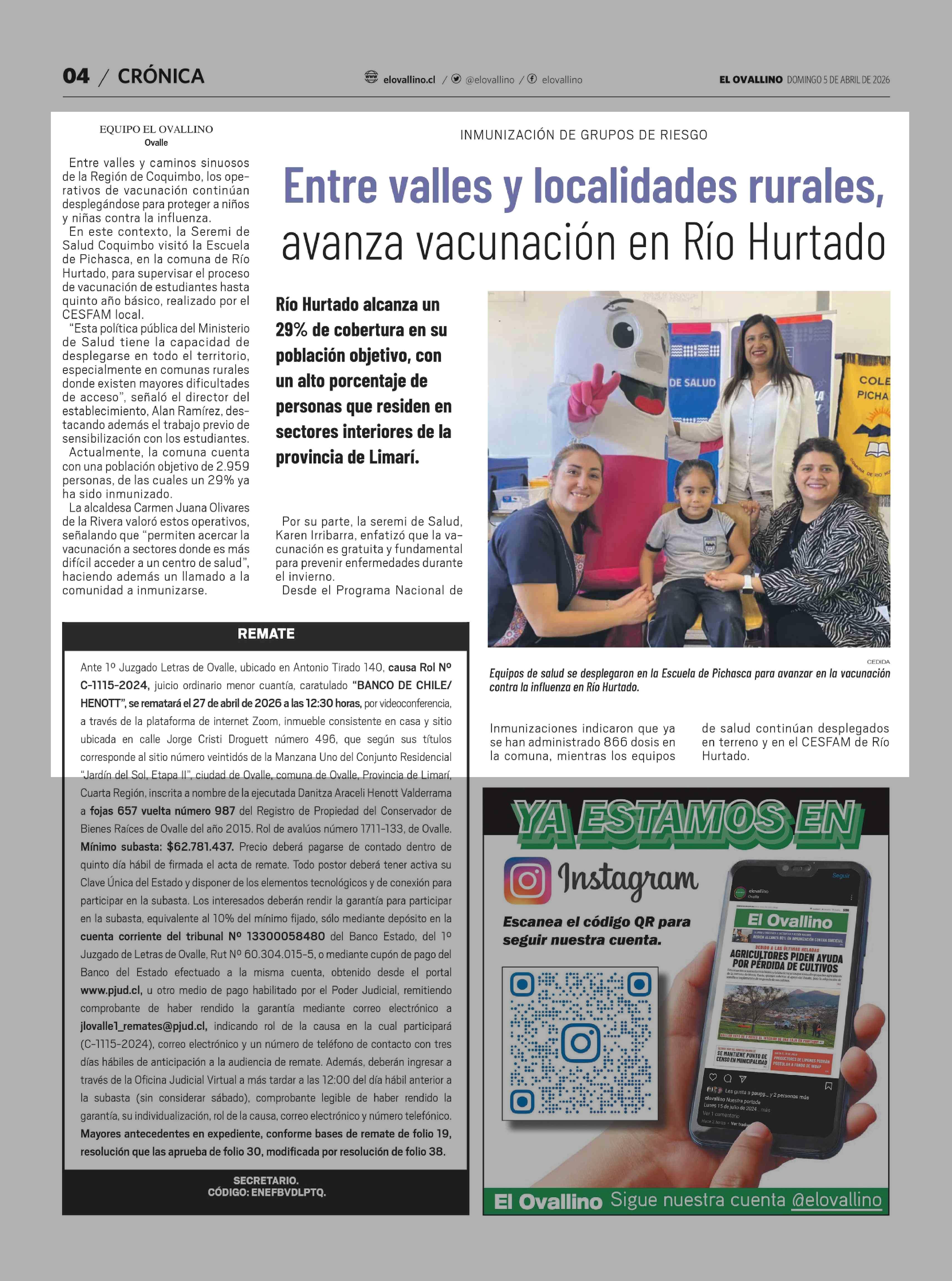 Título: Entre valles y localidades rurales, avanza vacunación en Río Hurtado