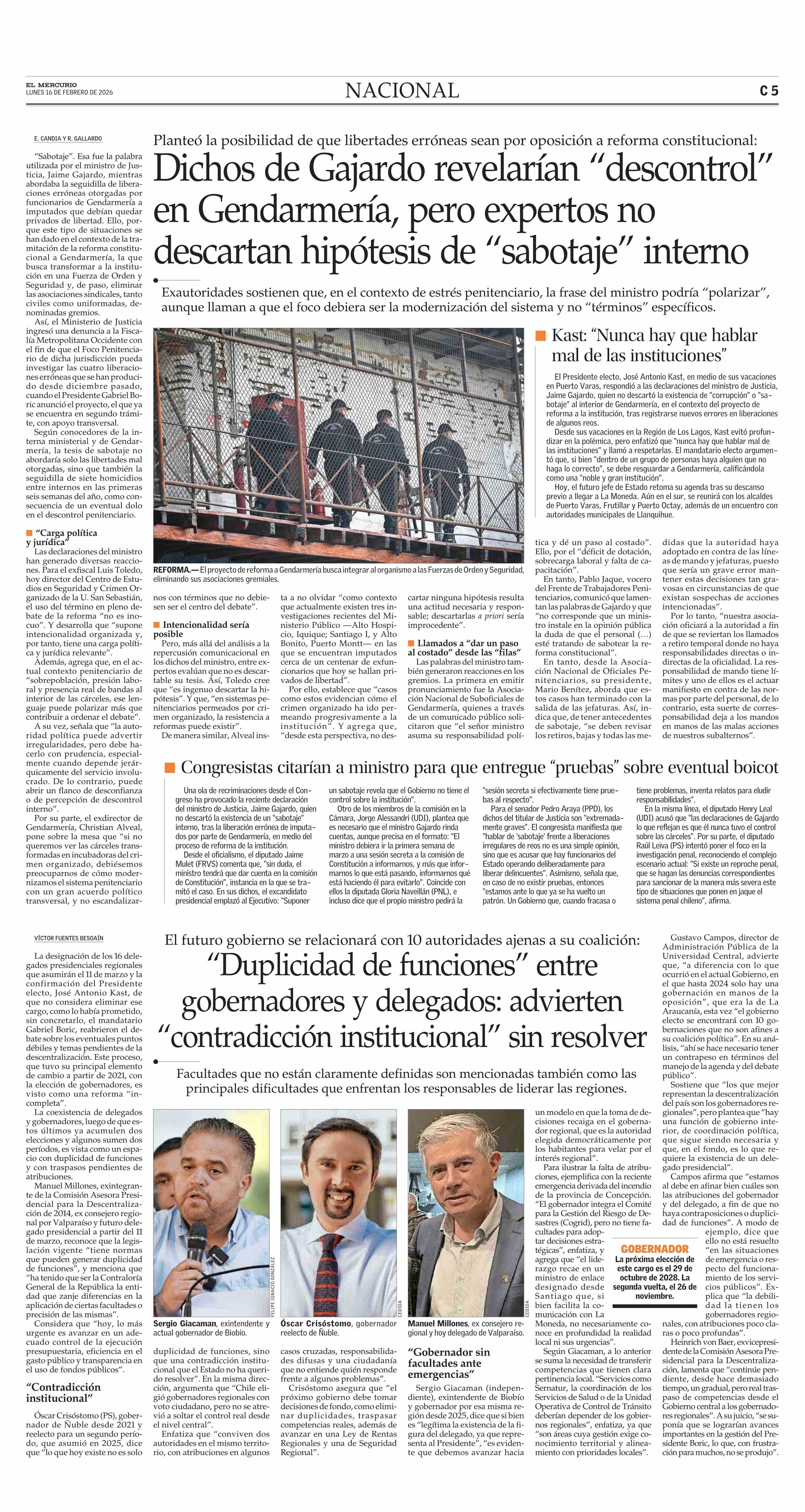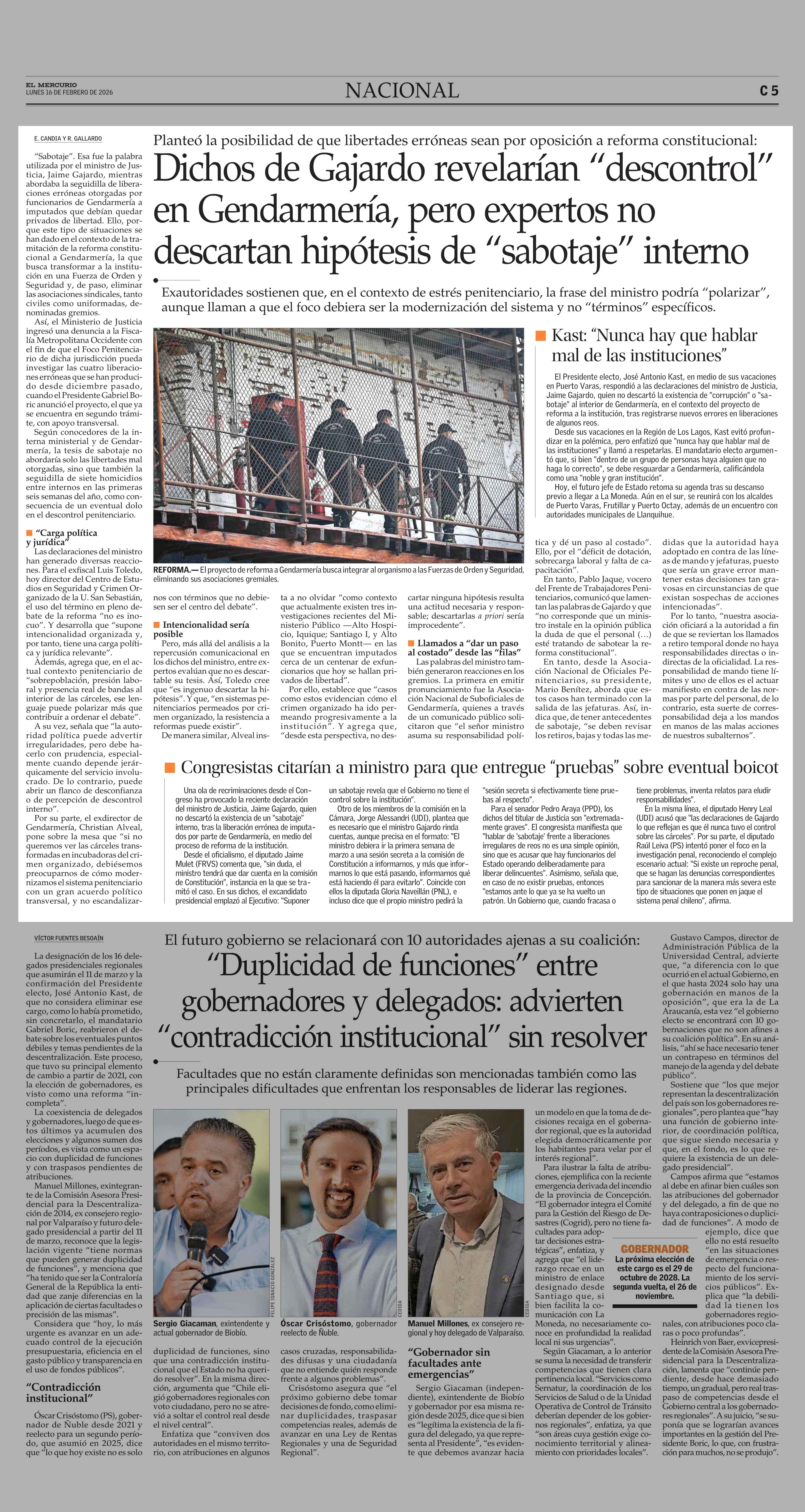 Dichos de Gajardo revelarían “descontrol” en Gendarmería, pero expertos no descartan hipótesis de “sabotaje” interno 16-02-2026 El Mercurio |