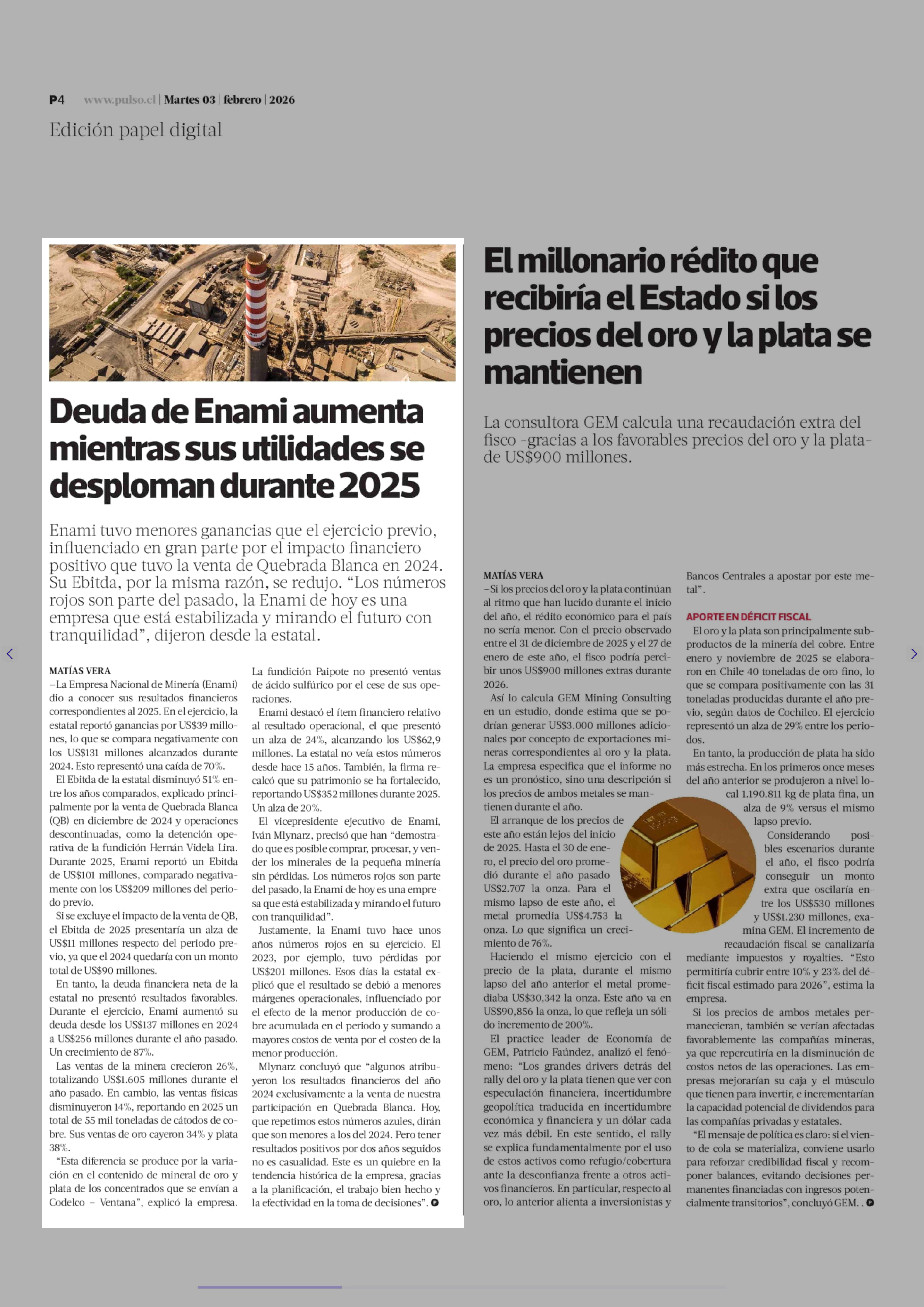 Título: Deuda de Enami aumenta mientras sus utilidades se desploman durante 2025