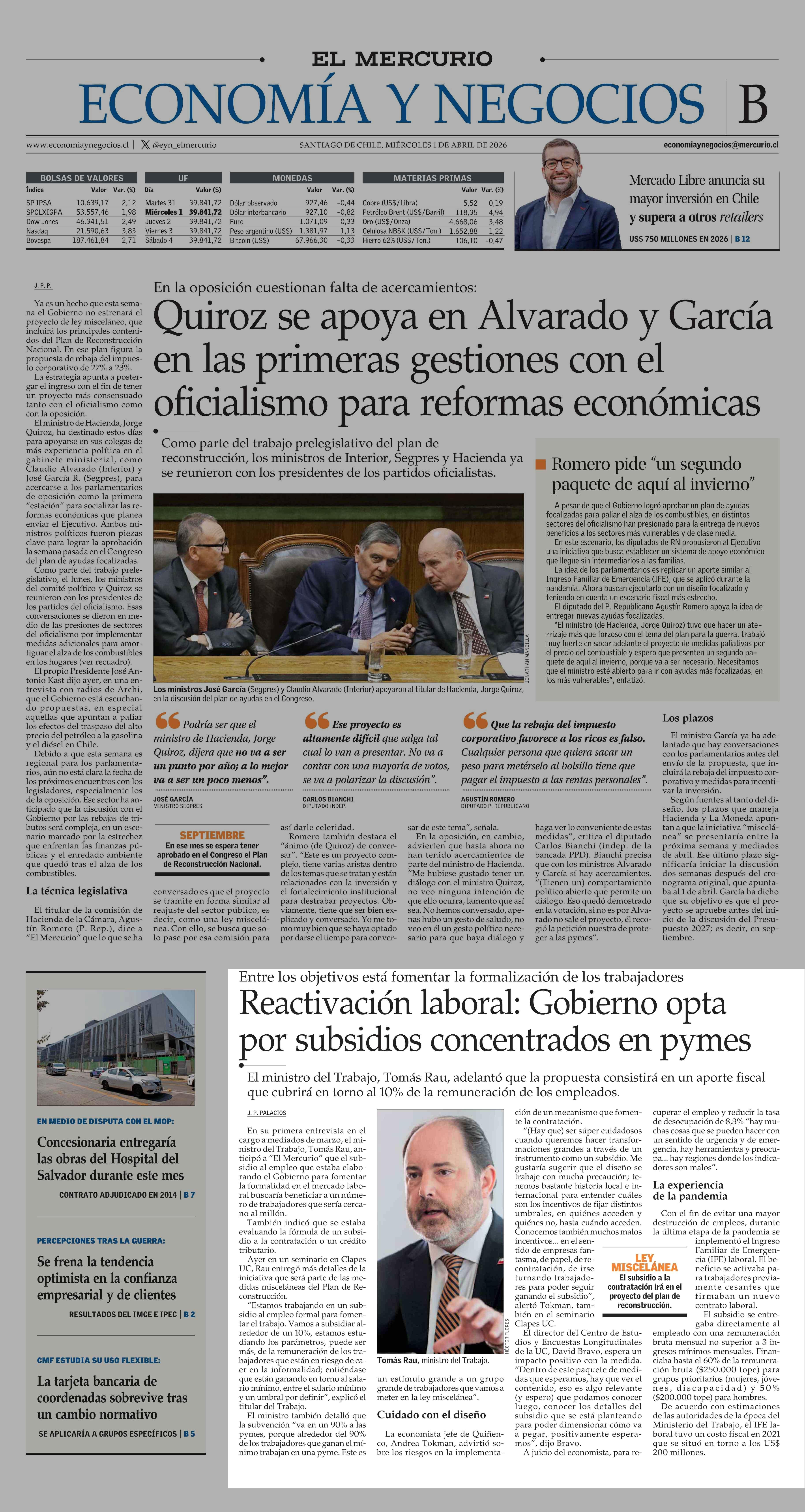 Reactivación laboral: Gobierno opta por subsidios concentrados en pymes 01-04-2026 El Mercurio |