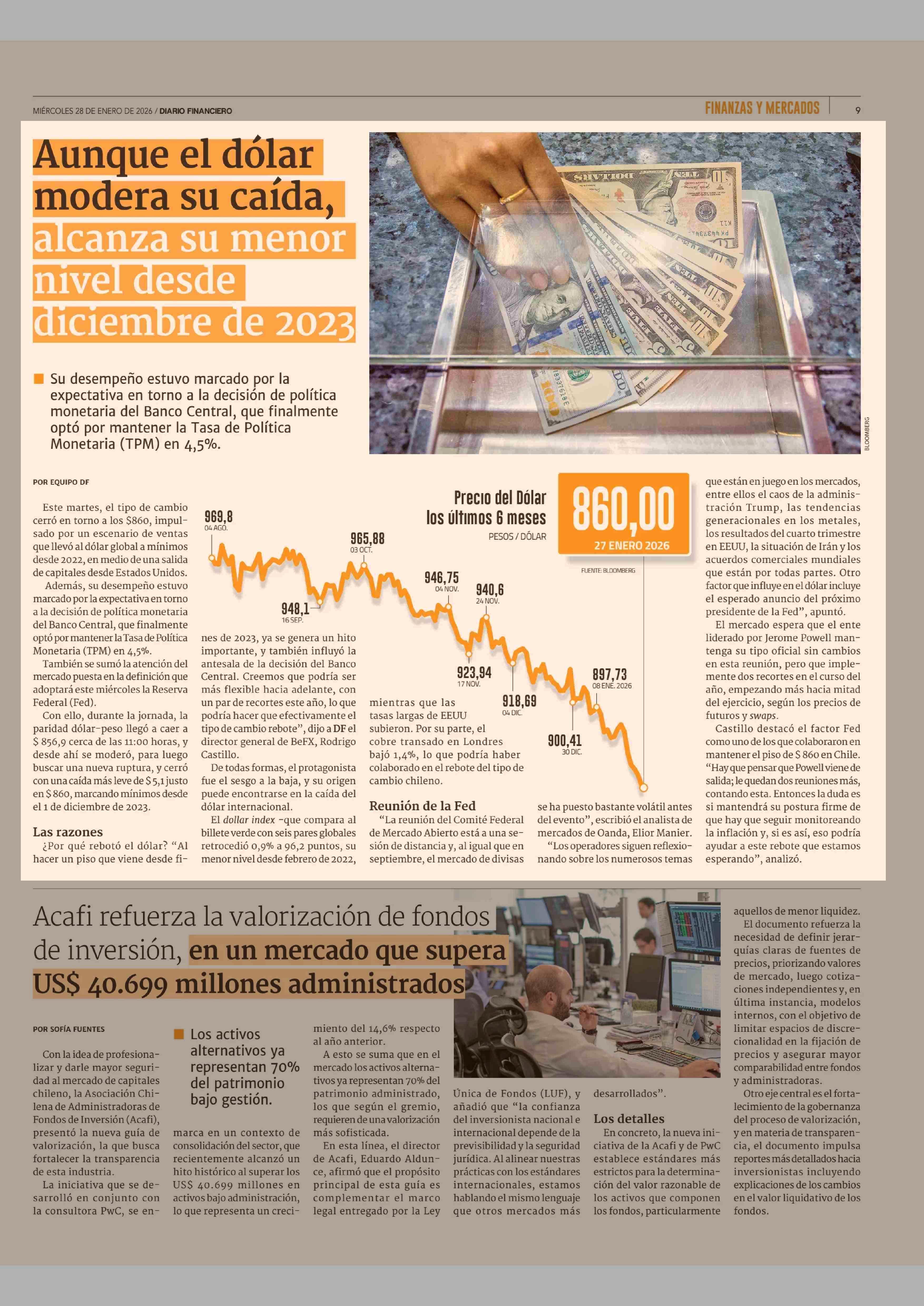 Aunque el dólar modera su caída, alcanza su menor nivel desde diciembre de 2023 28-01-2026 Diario Financiero |