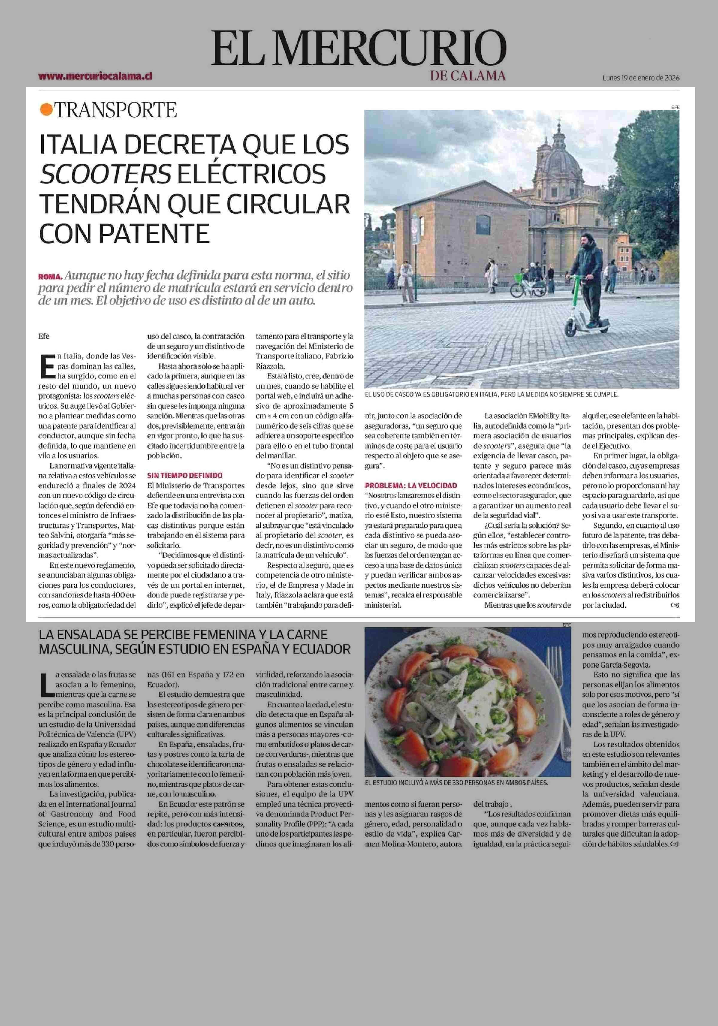 ITALIA DECRETA QUE LOS SCOOTERS ELÉCTRICOS TENDRÁN QUE CIRCULAR CON PATENTE 19-01-2026 El Mercurio de Calama |