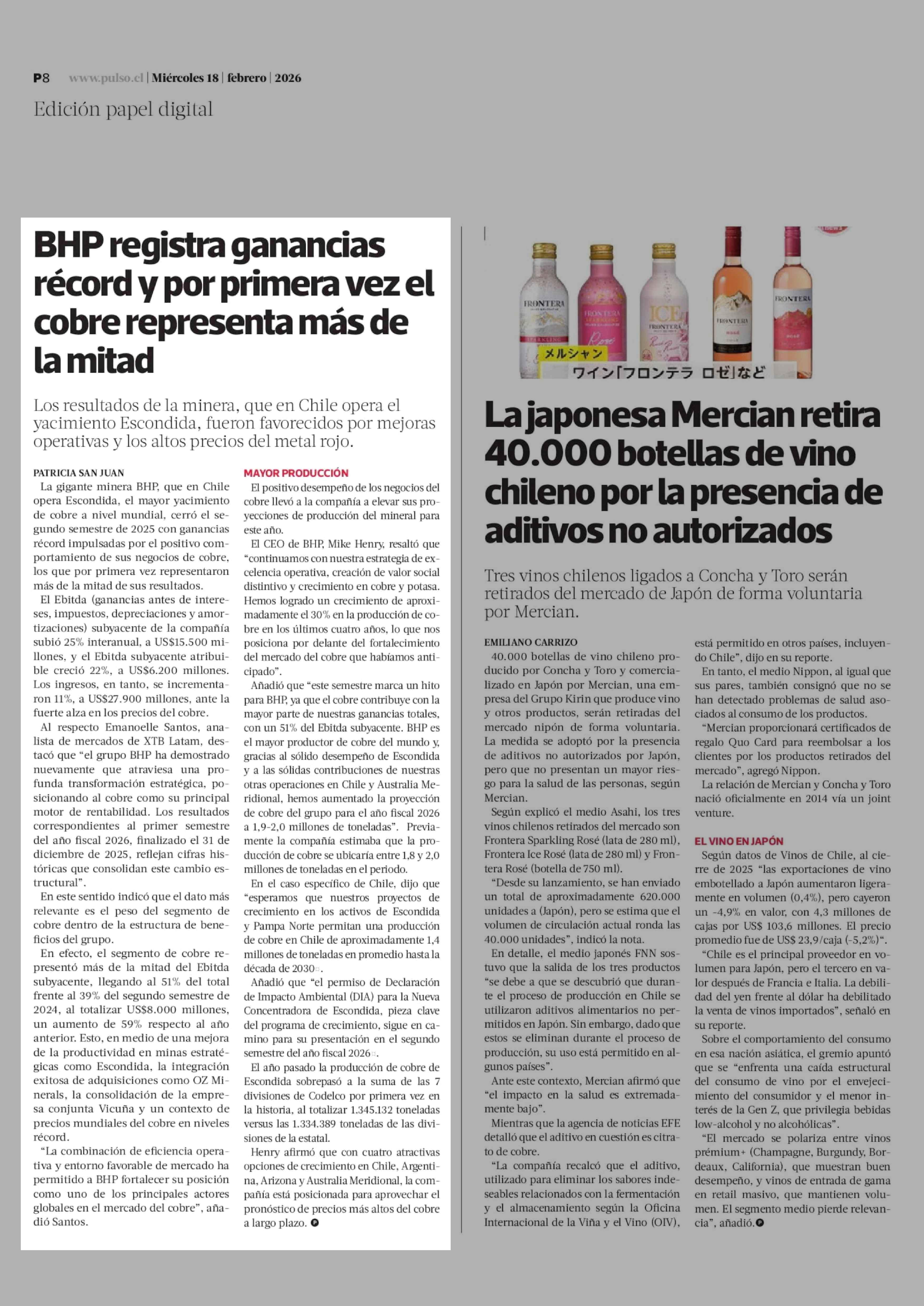 BHP registra ganancias récord y por primera vez el cobre representa más de la mitad 18-02-2026 La Tercera |