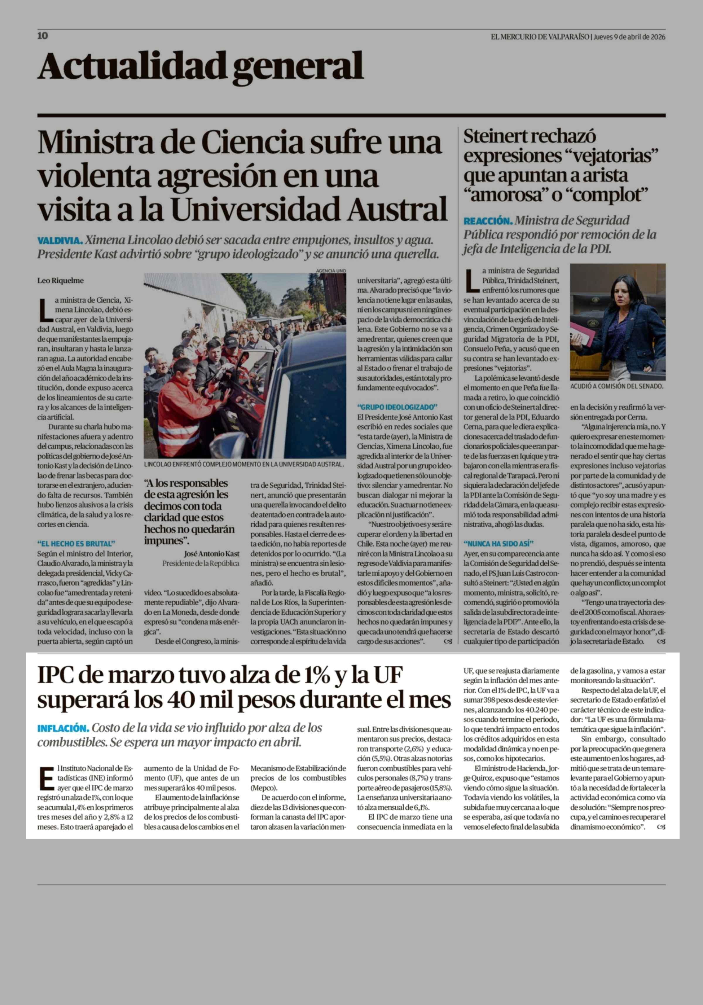 IPC de marzo tuvo alza de 1% y la UF superará los 40 mil pesos durante el mes 09-04-2026 El Mercurio de Valparaíso |