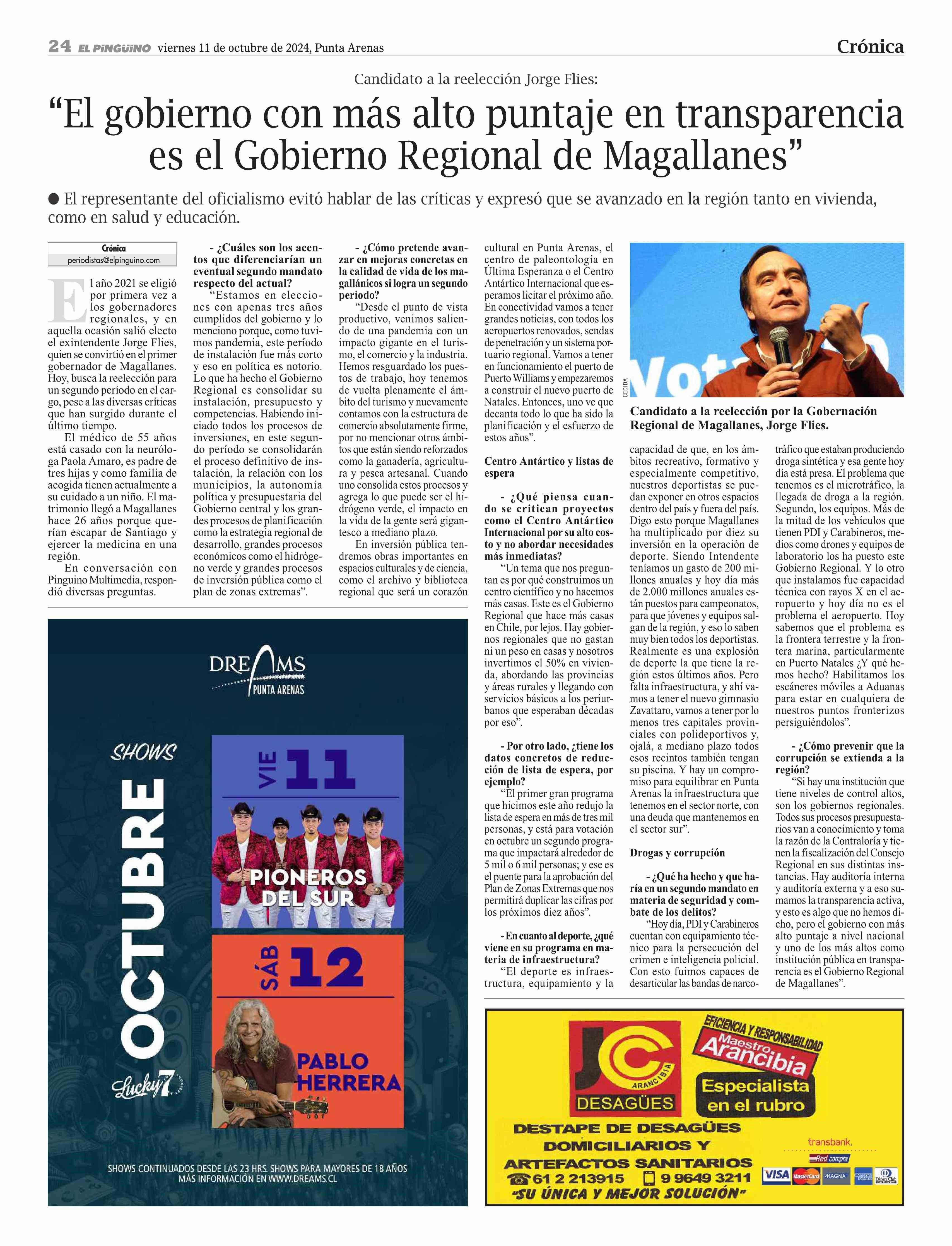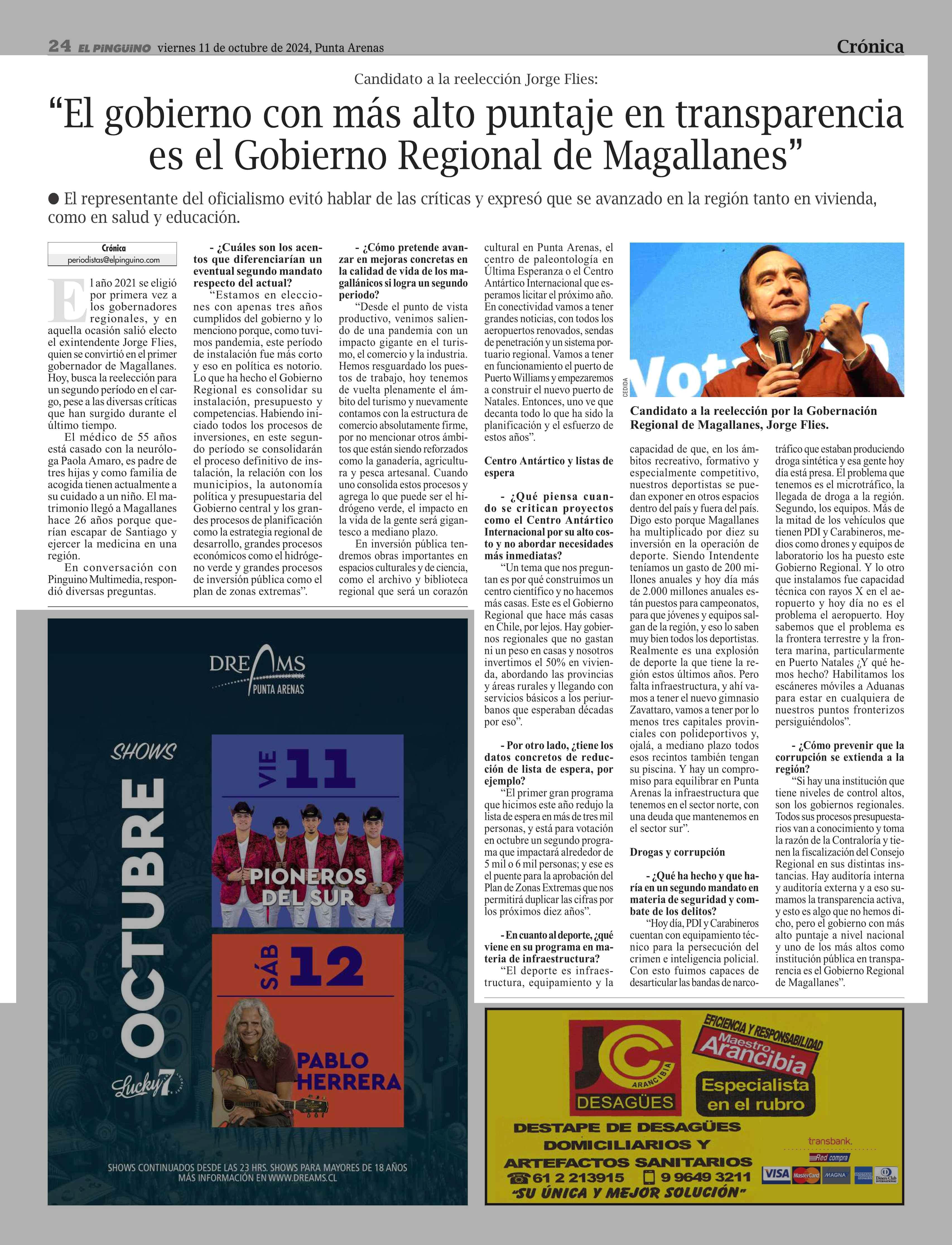 “El gobierno con más alto puntaje en transparencia es el Gobierno Regional de Magallanes” 11-10-2024 El Pingüino |
