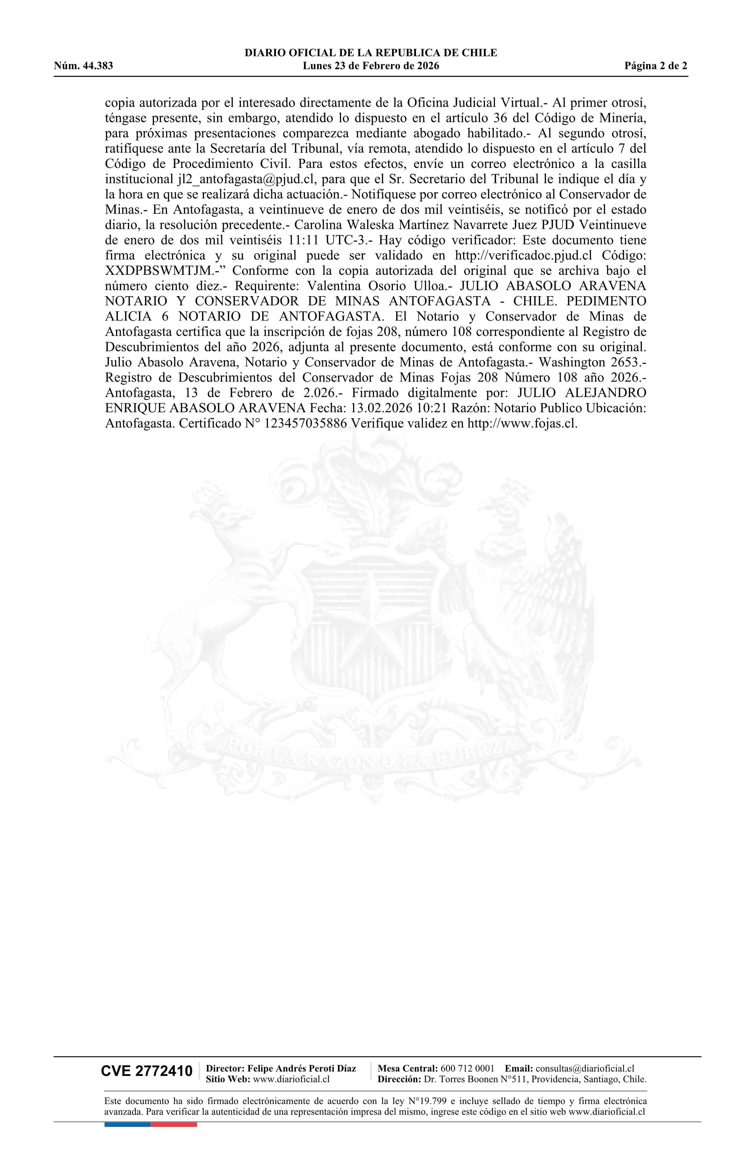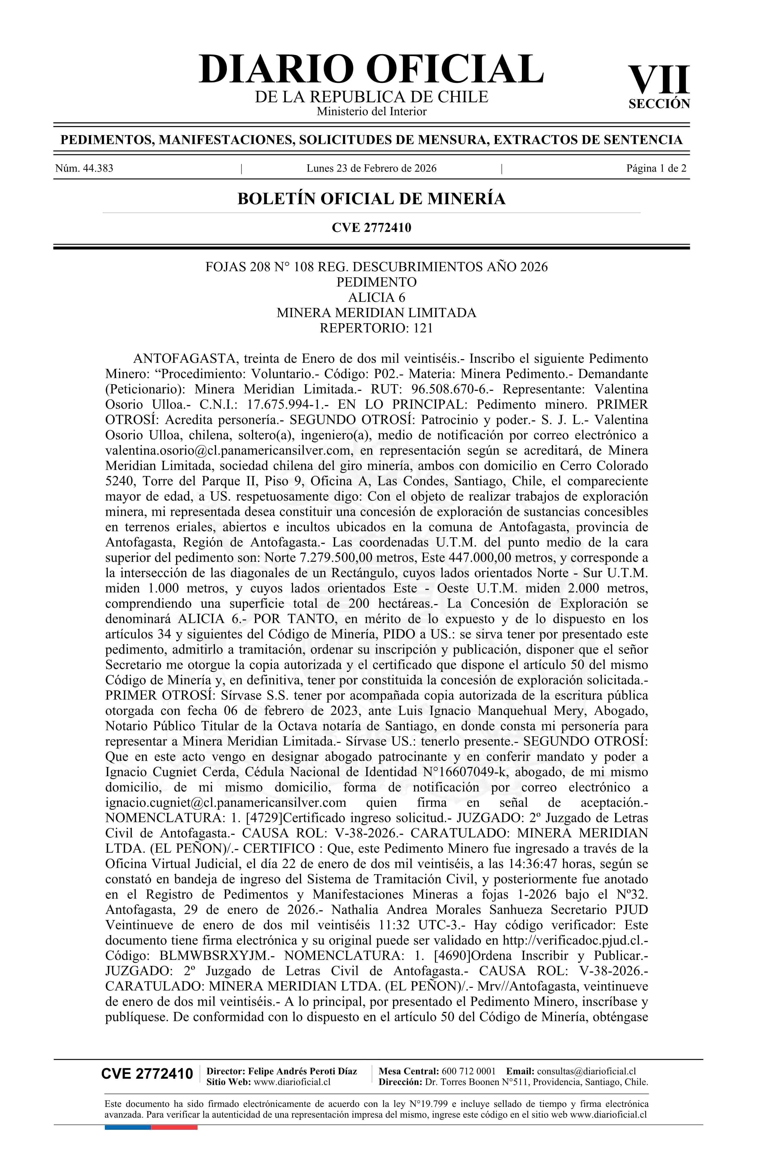 ALICIA 6 / Minera Meridian Limitada 23-02-2026 DIARIO OFICIAL CHILE - BOLETÍN OFICIAL DE MINERÍA |