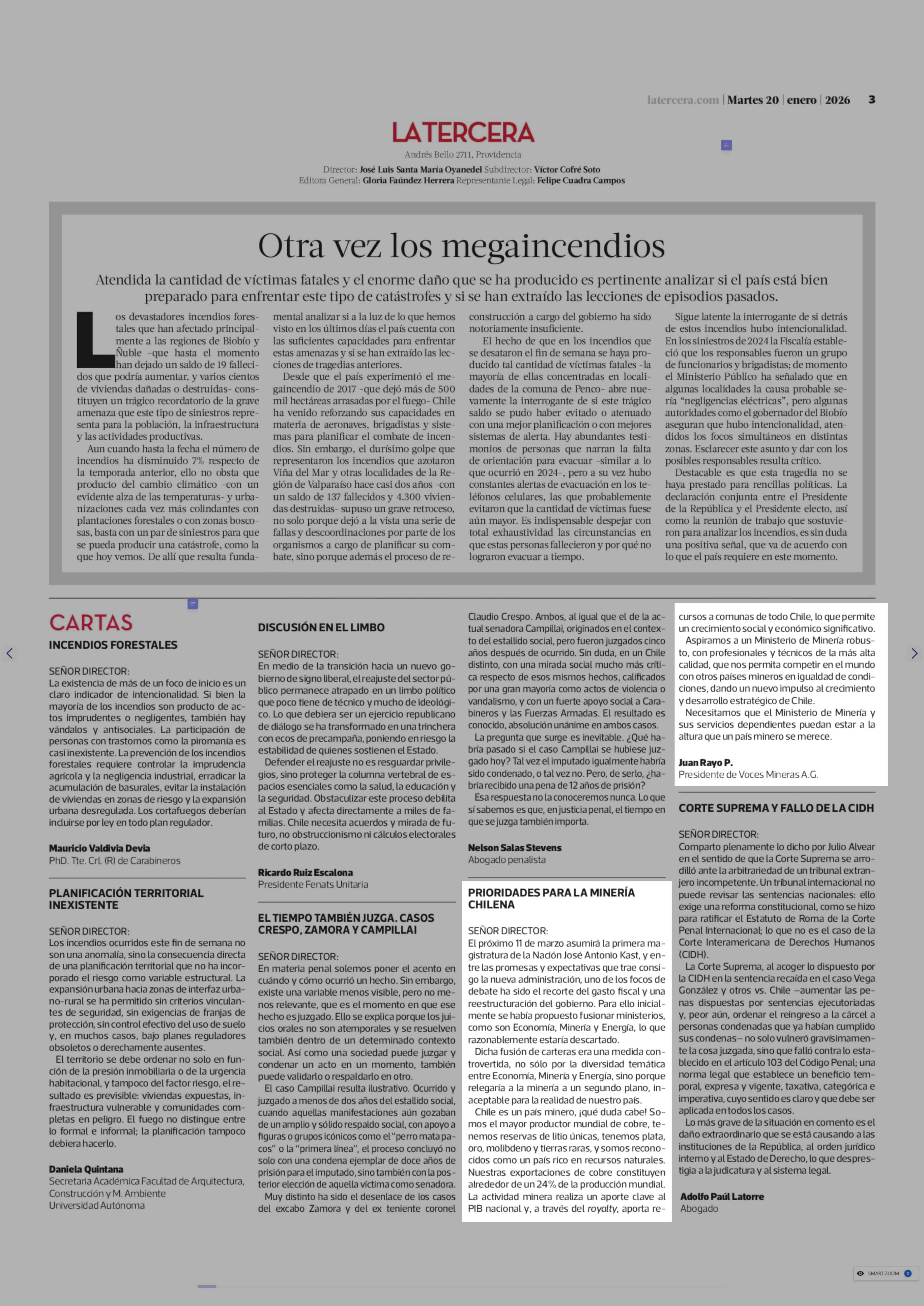 Cartas: PRIORIDADES PARA LA MINERÍA CHILENA 20-01-2026 La Tercera |