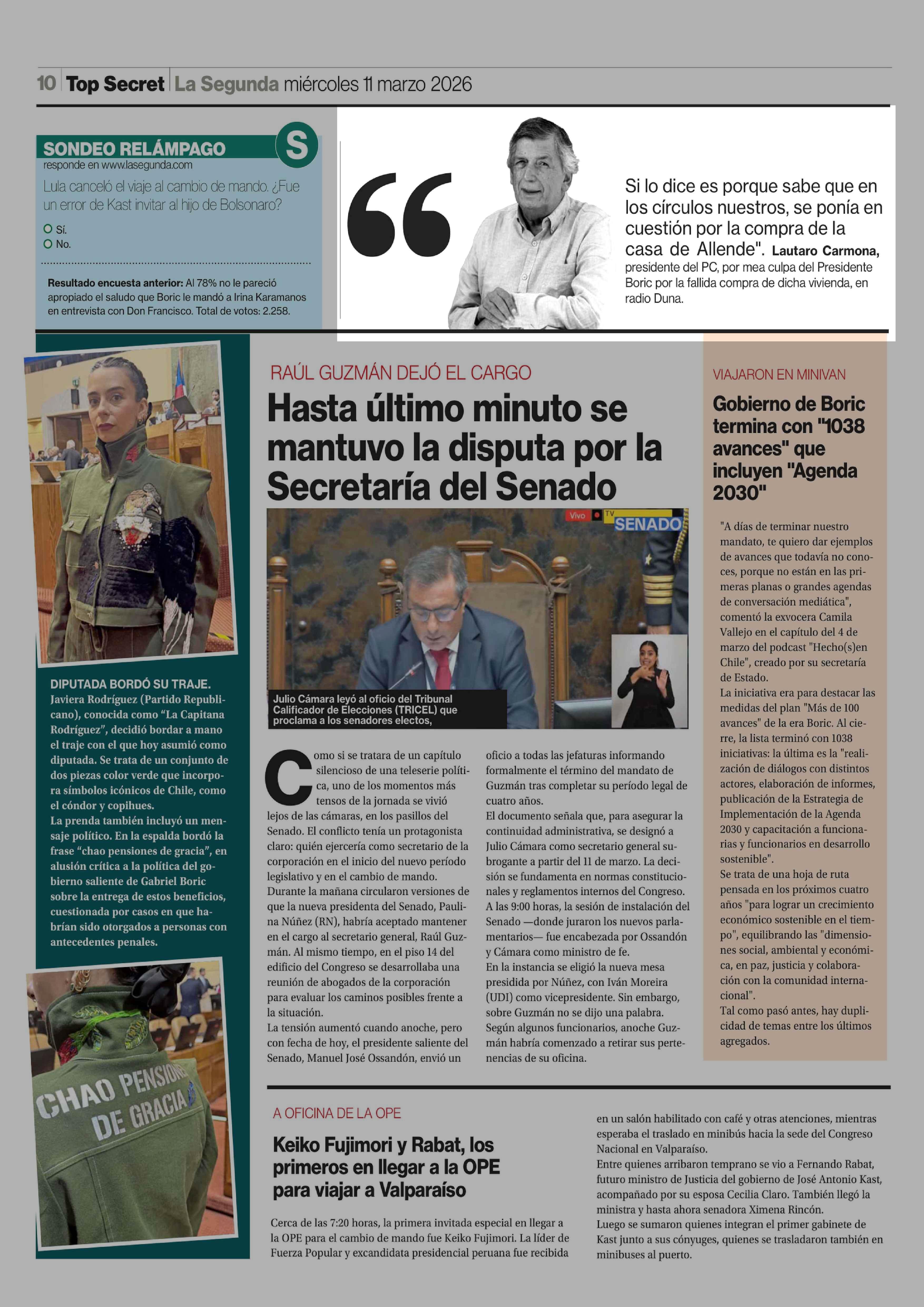 Lautaro Carmona, presidente del PC, por mea culpa del Presidente Boric por la fallida compra de dicha vivienda, en radio Duna. 11-03-2026 La Segunda |