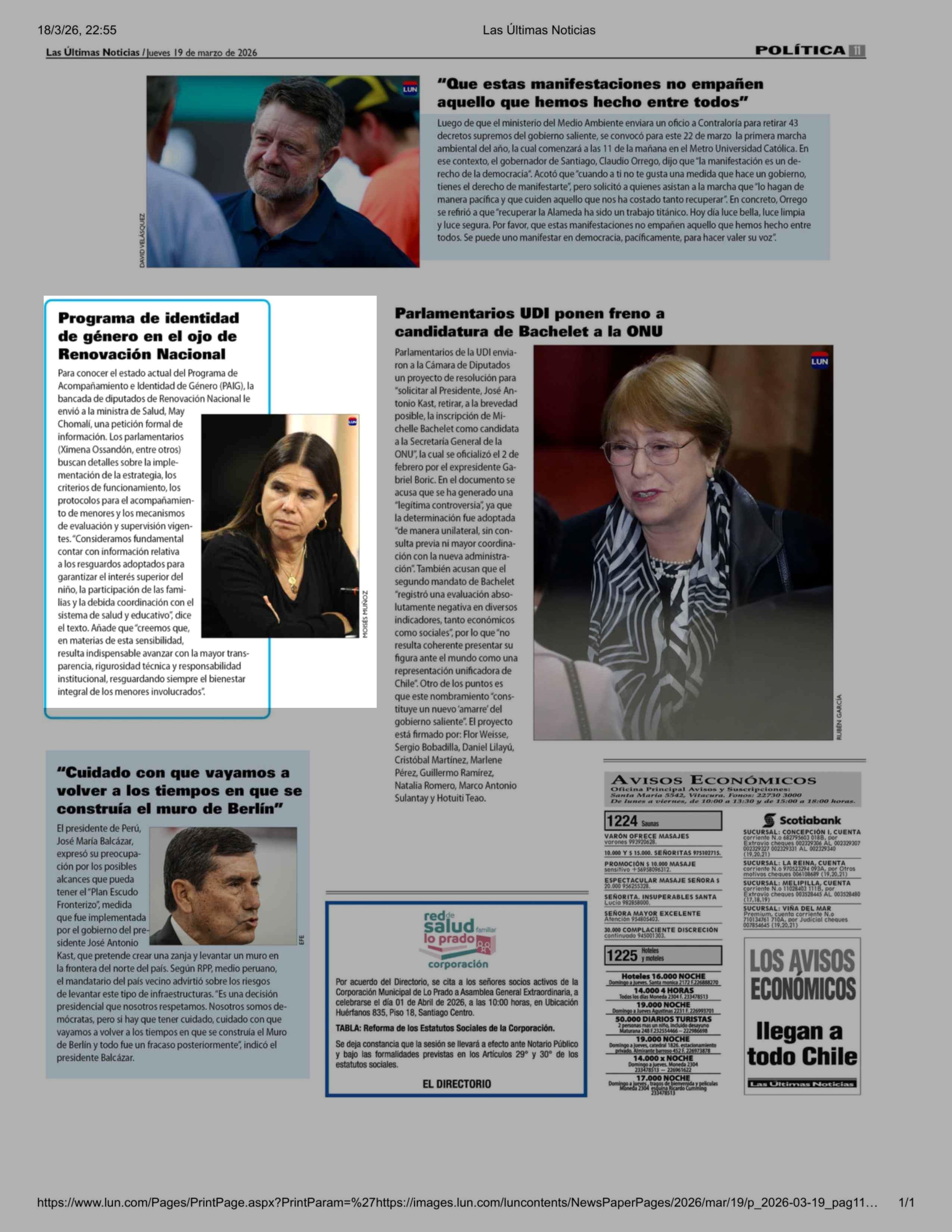 Programa de identidad de género en el ojo de Renovación Nacional 19-03-2026 Las Últimas Noticias |