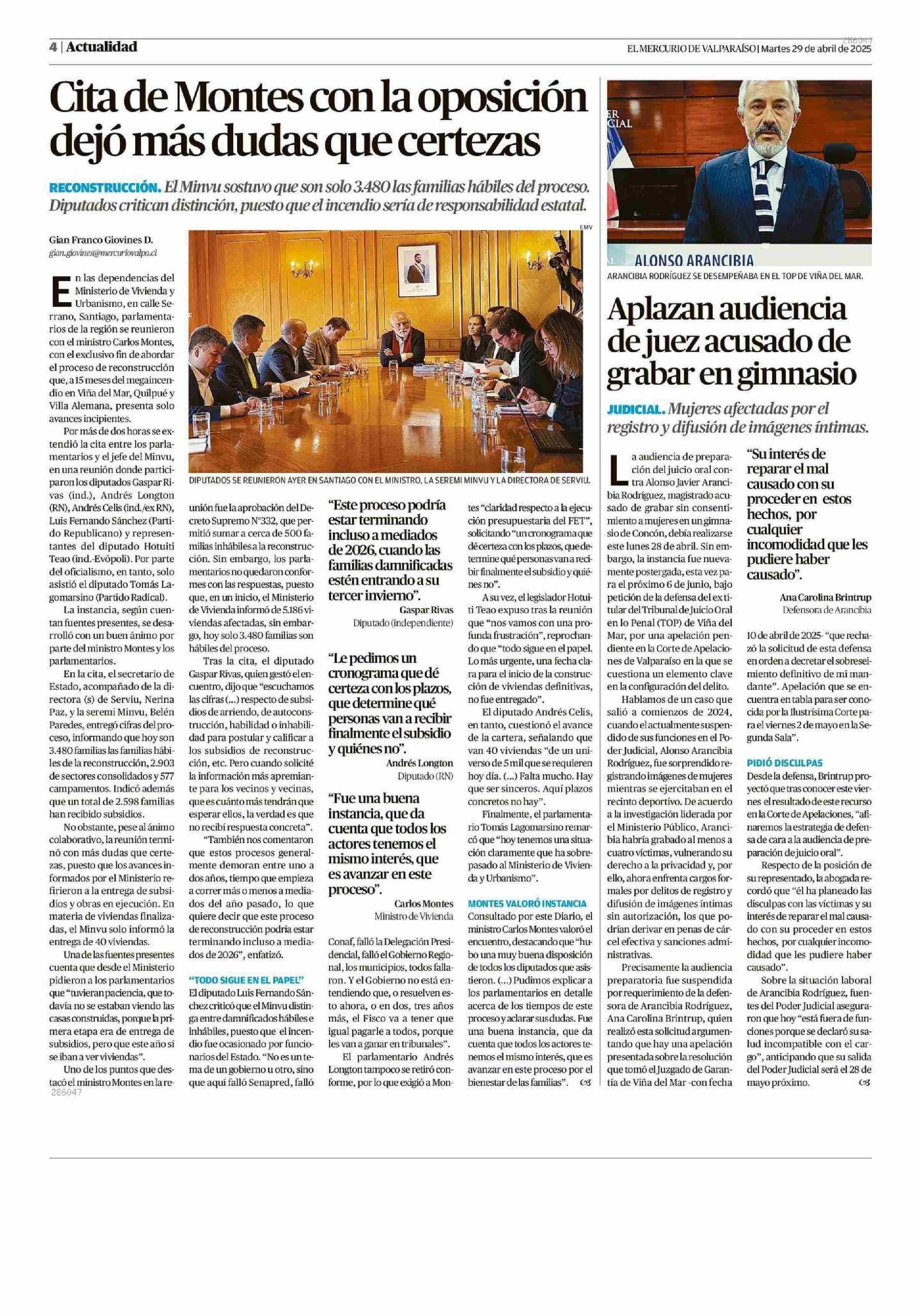 Cita de Montes con la oposición dejó más dudas que certezas 29-04-2025 El Mercurio de Valparaíso |