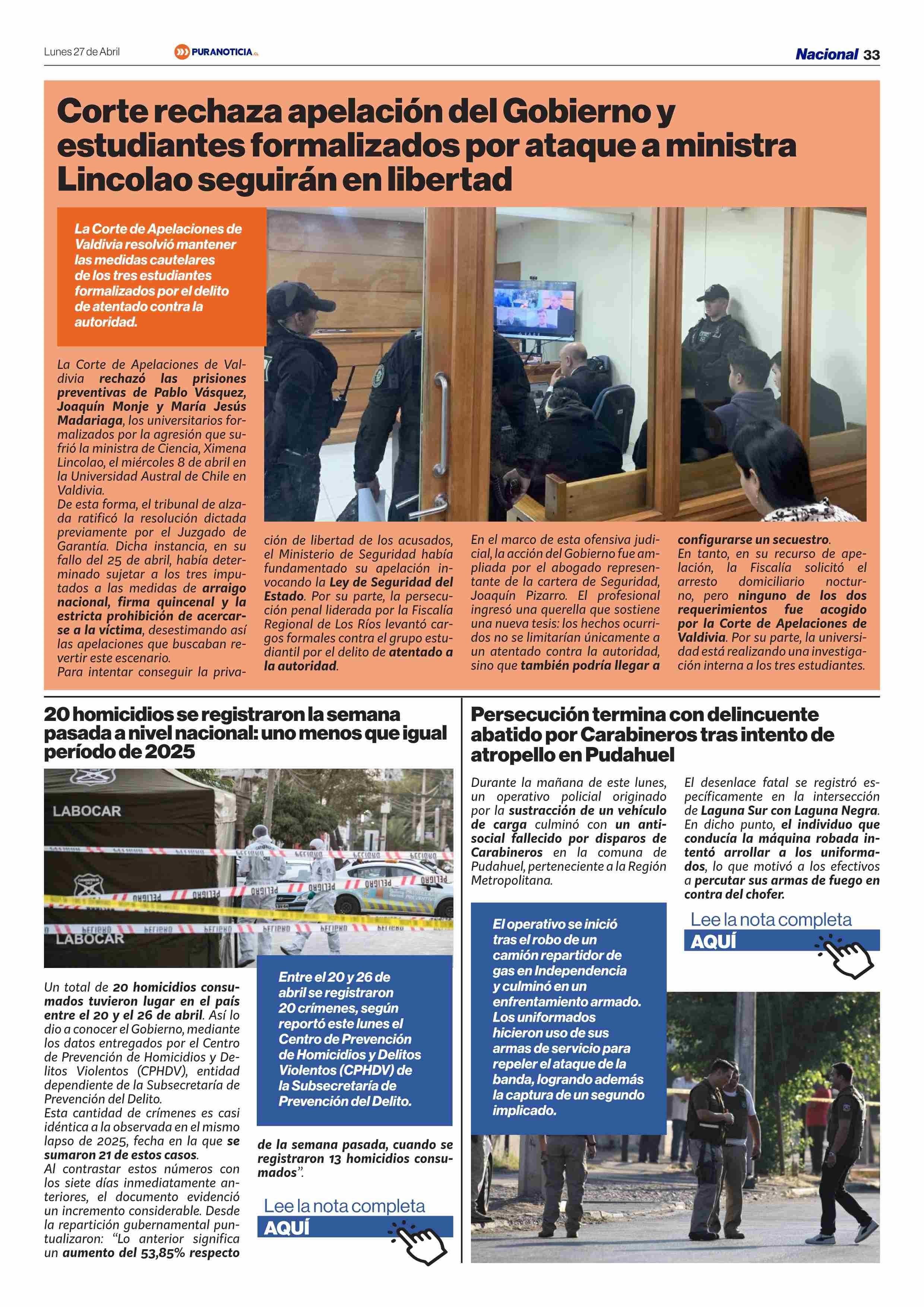 Corte rechaza apelación del Gobierno y estudiantes formalizados por ataque a ministra Lincolao seguirán en libertad 27-04-2026 Puranoticia.cl |