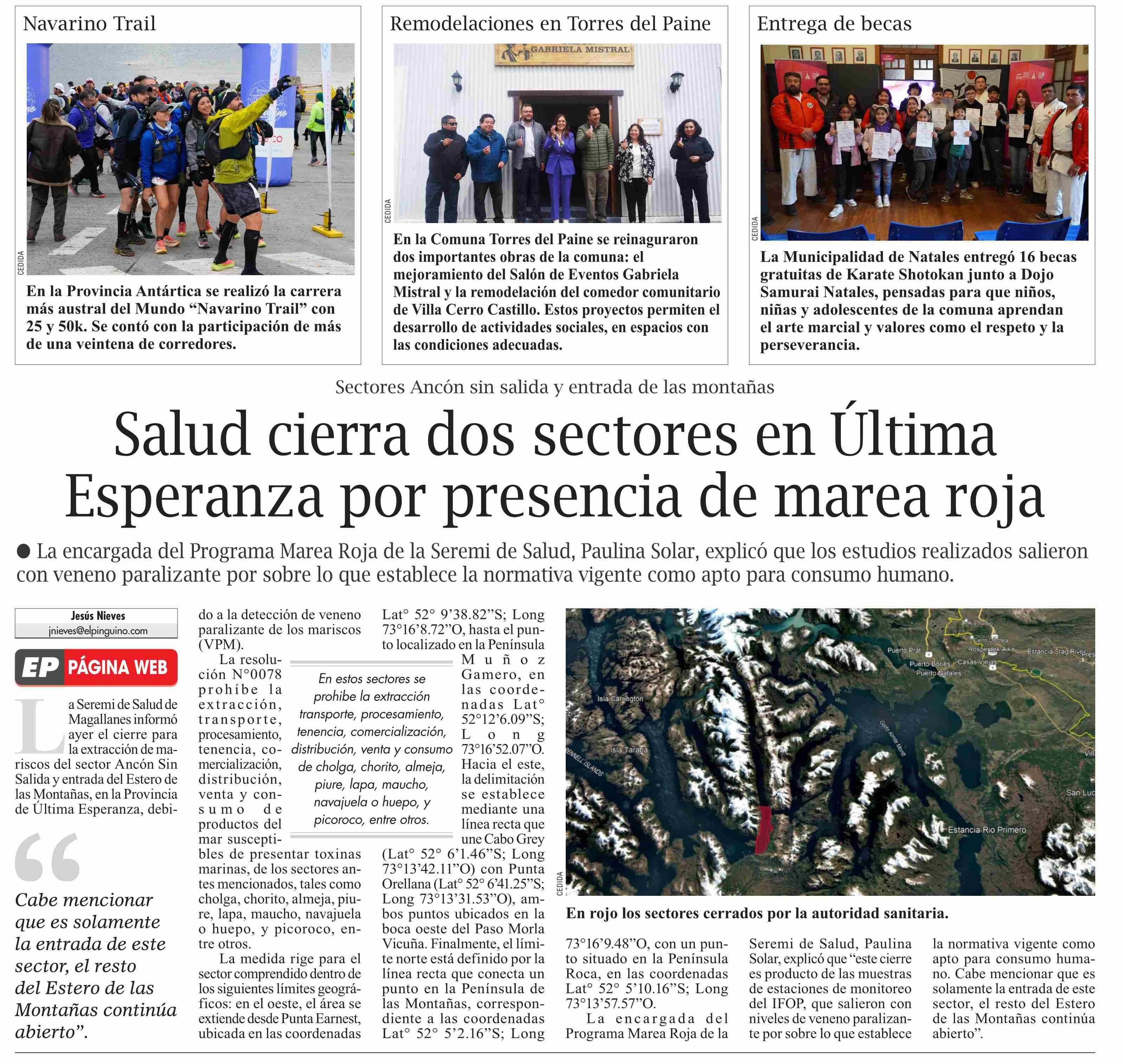 Salud cierra dos sectores en Última Esperanza por presencia de marea roja 20-01-2026 El Pingüino |