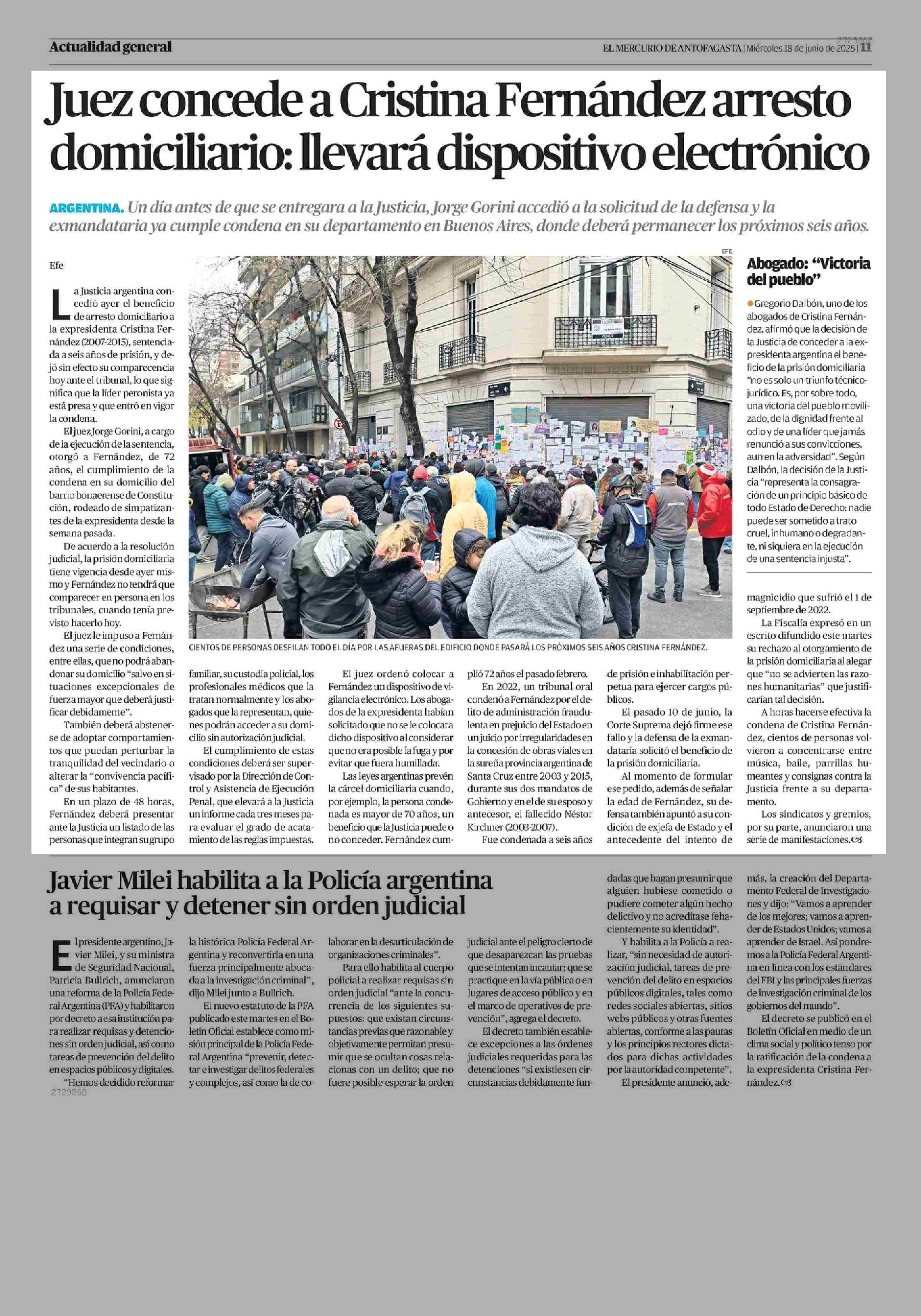 Juez concede a Cristina Fernández arresto domiciliario: llevará dispositivo electrónico 18-06-2025 El Mercurio de Antofagasta |
