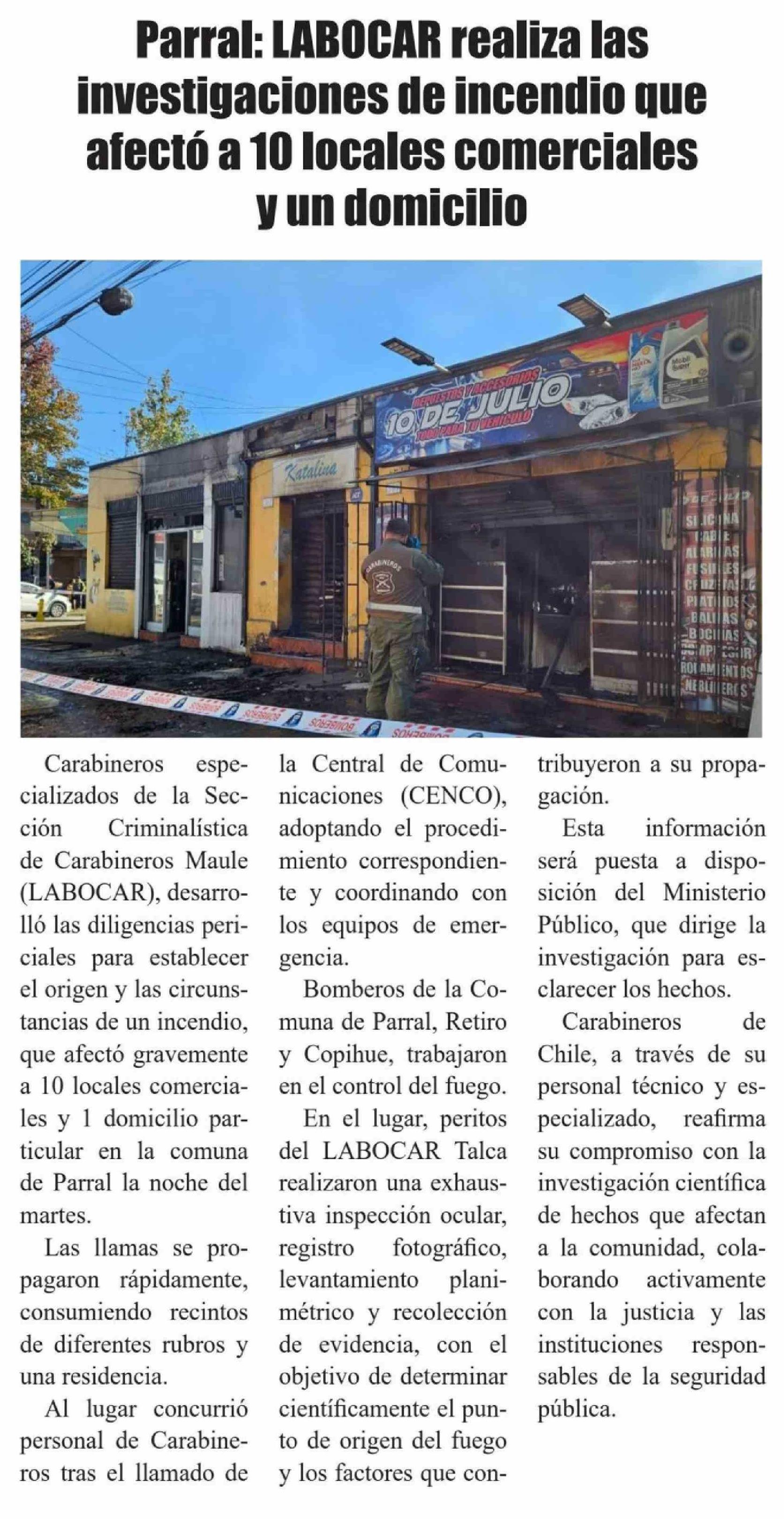 Título: Parral: LABOCAR realiza las investigaciones de incendio que afectó a 10 locales comerciales y un domicilio