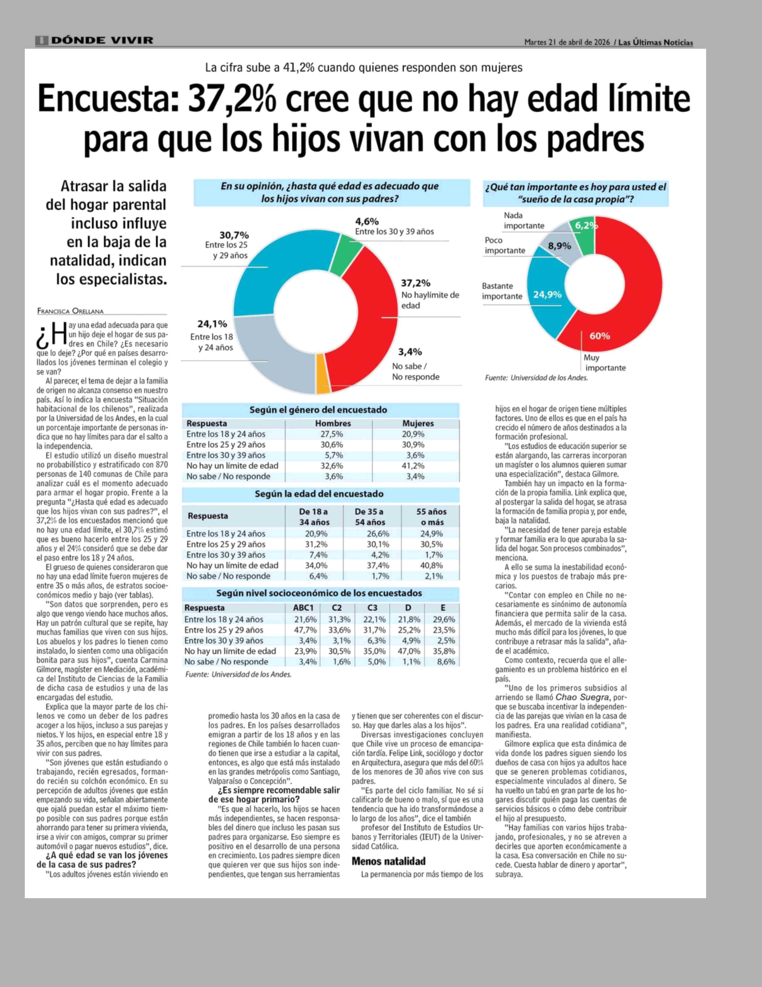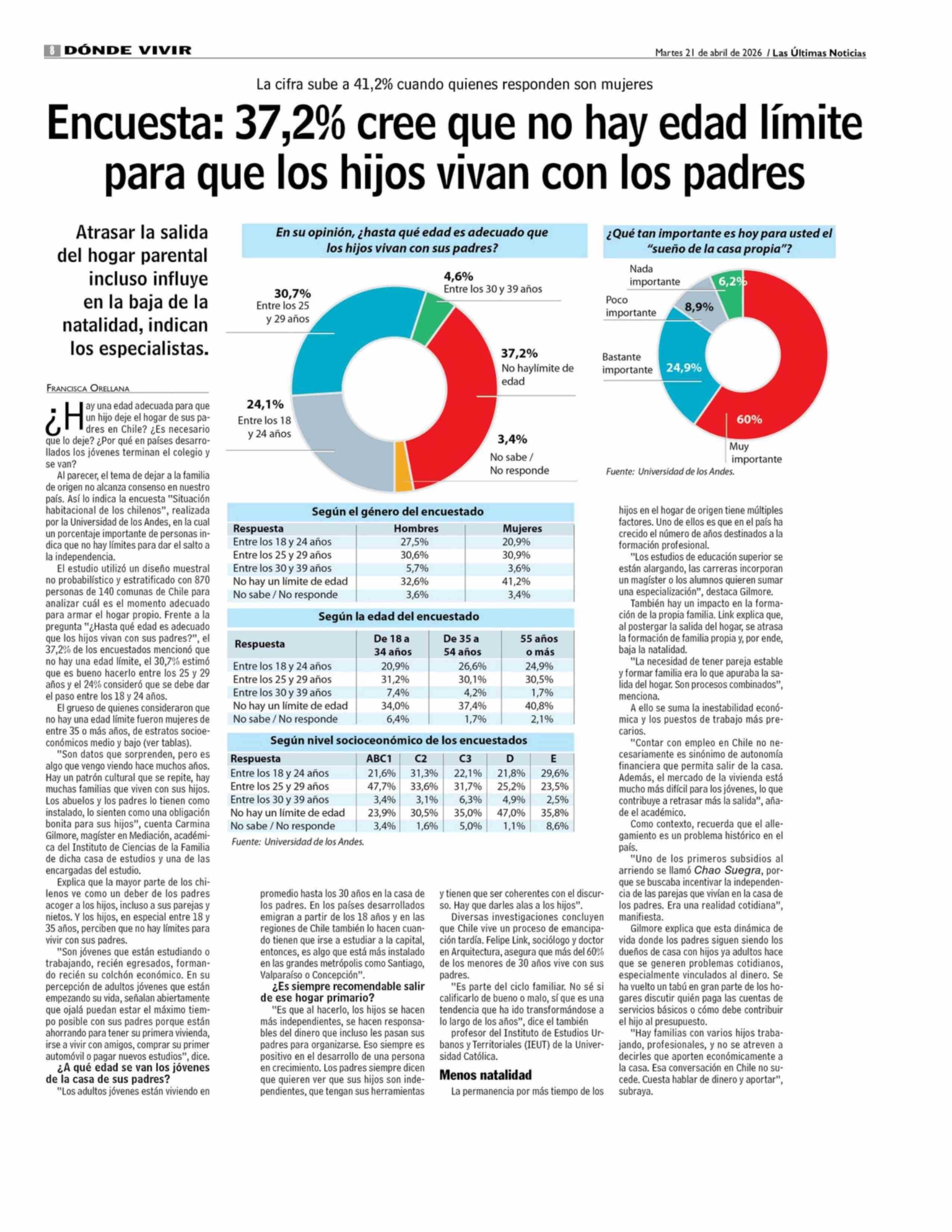 Encuesta: 37,2% cree que no hay edad limite para que los hijos vivan con los padres 21-04-2026 Las Últimas Noticias |