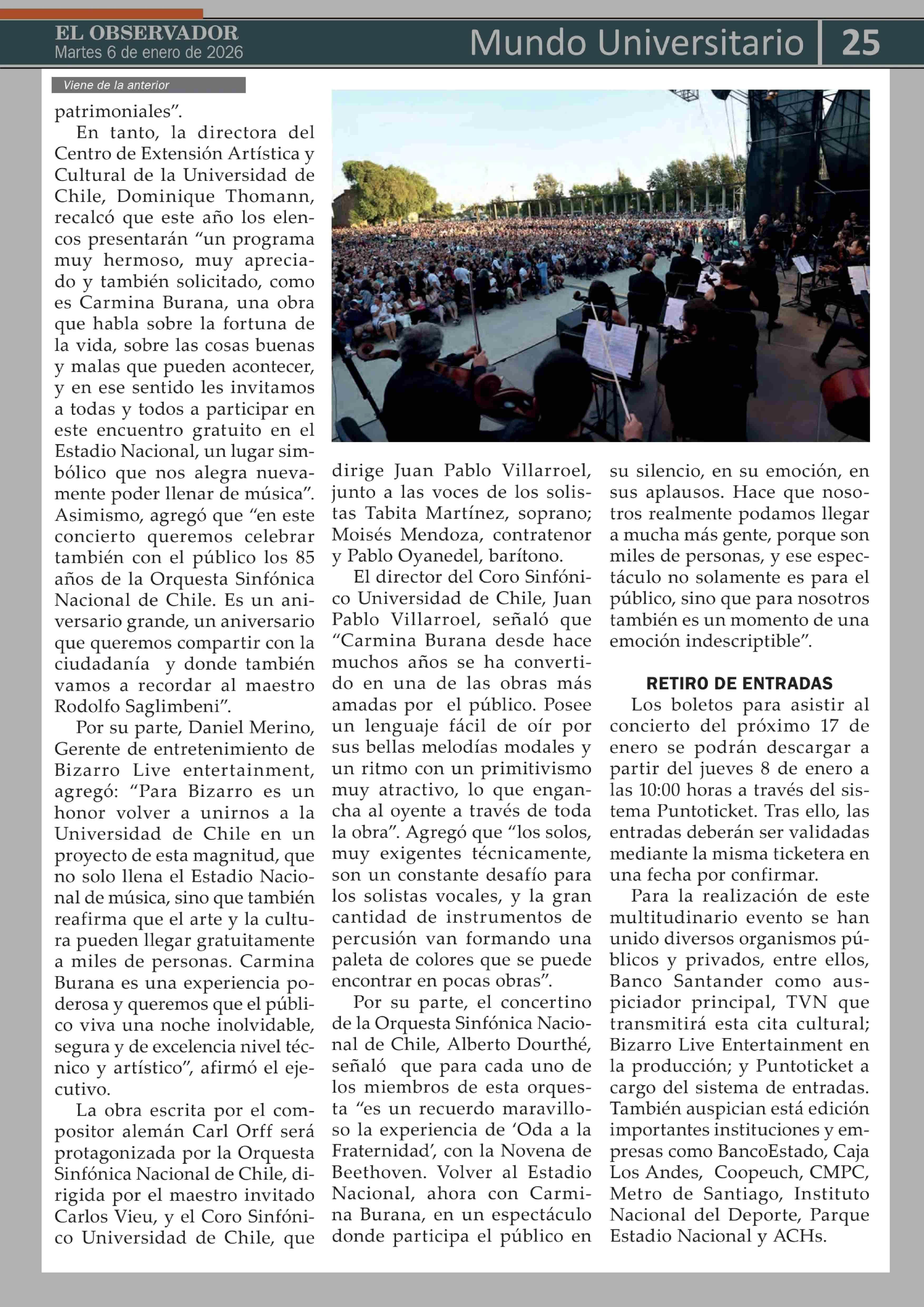 U. de Chile y sus elencos artísticos regresan al Estadio Nacional con "Carmina Burana" 06-01-2026 El Observador Vespertino |