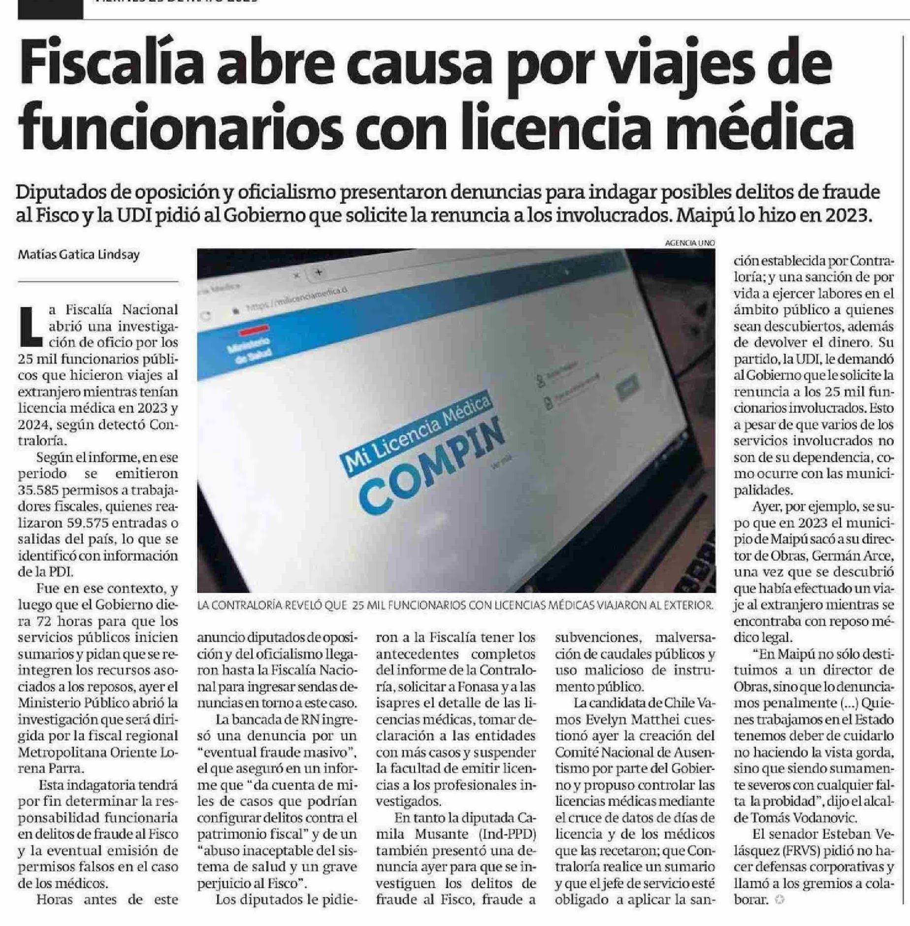 | Título: | Fiscalía abre causa por viajes de funcionarios con licencia médica |