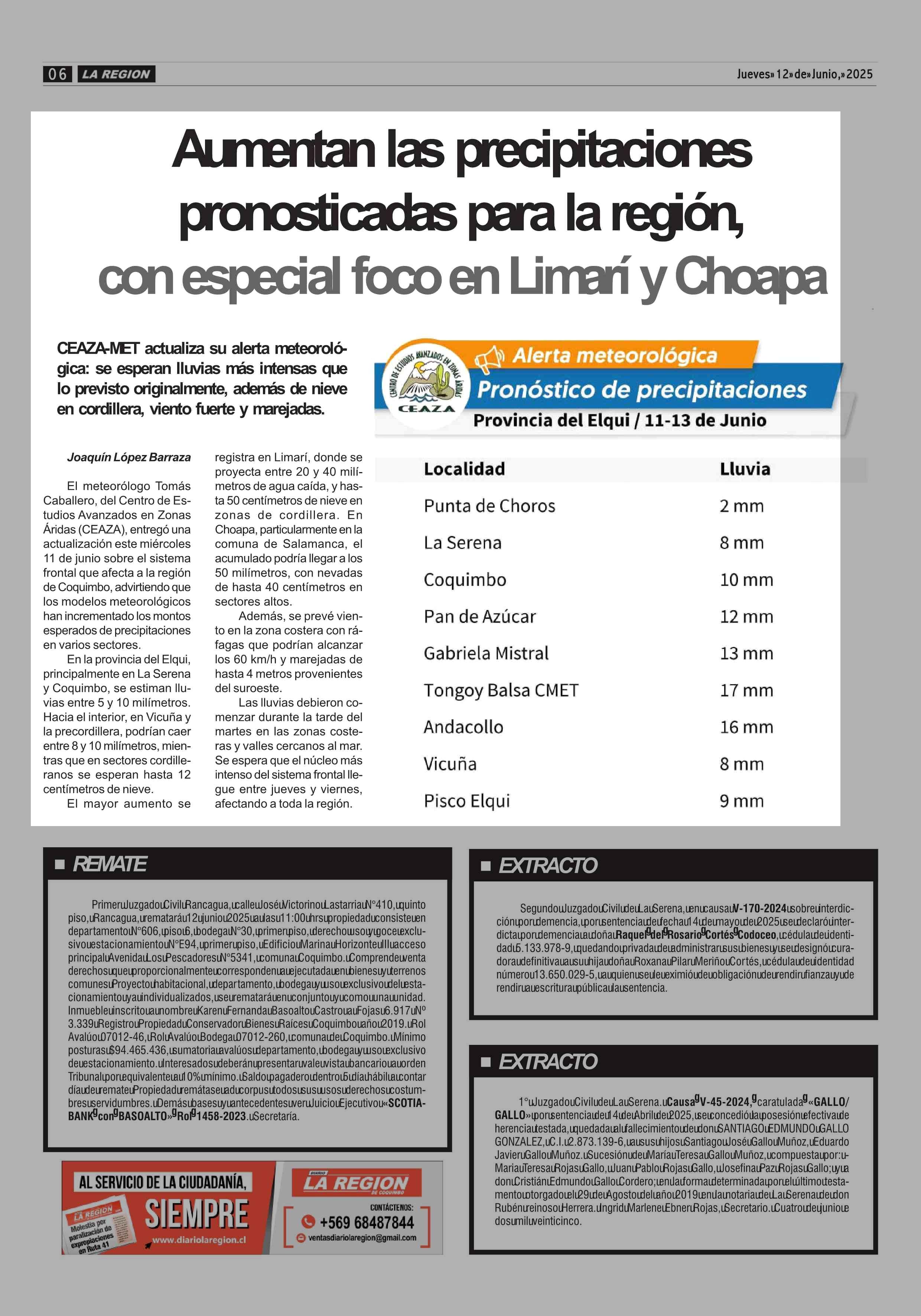 Aumentan las precipitaciones pronosticadas para la región, con especial foco en Limarí y Choapa 12-06-2025 Diario la Región |