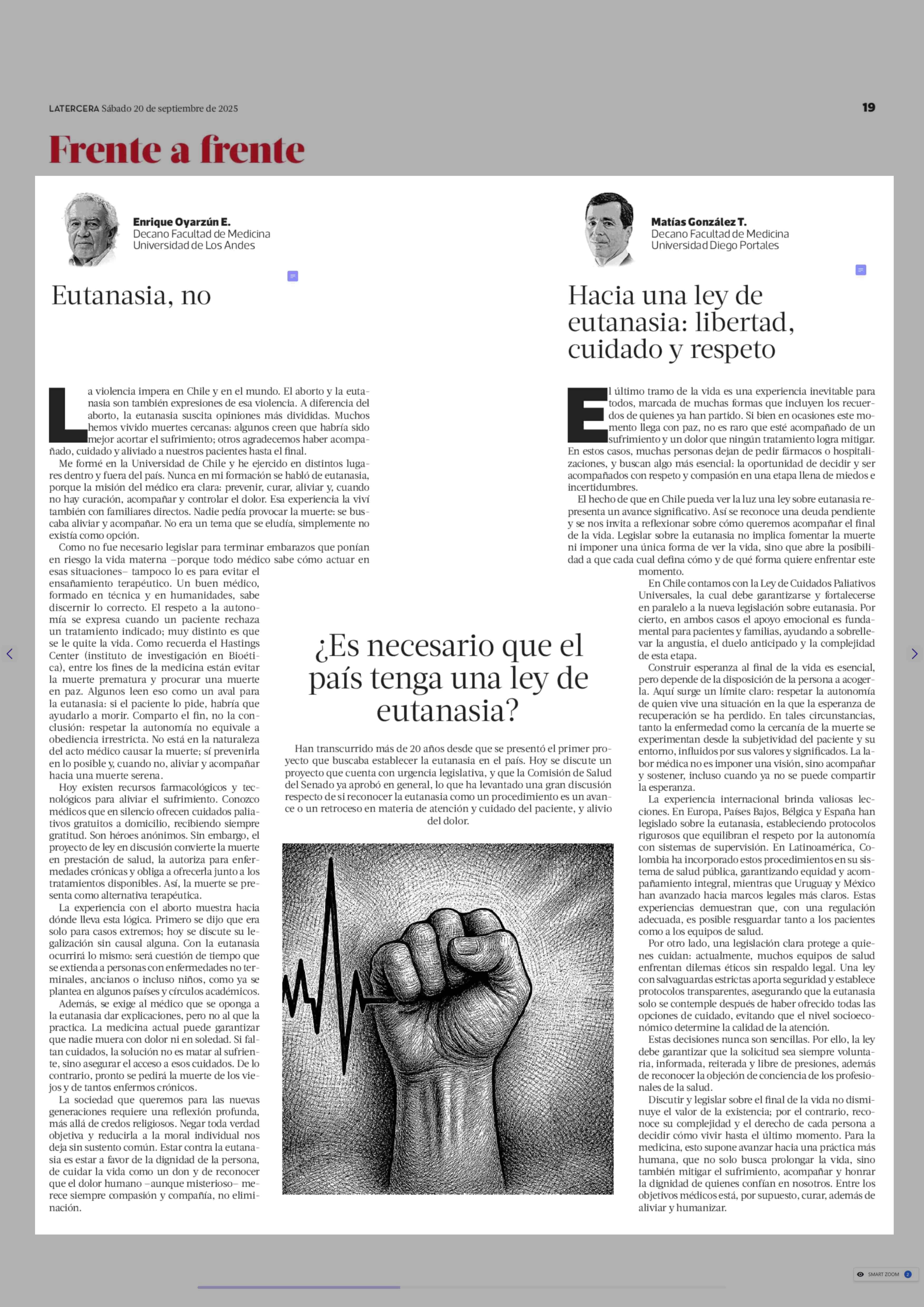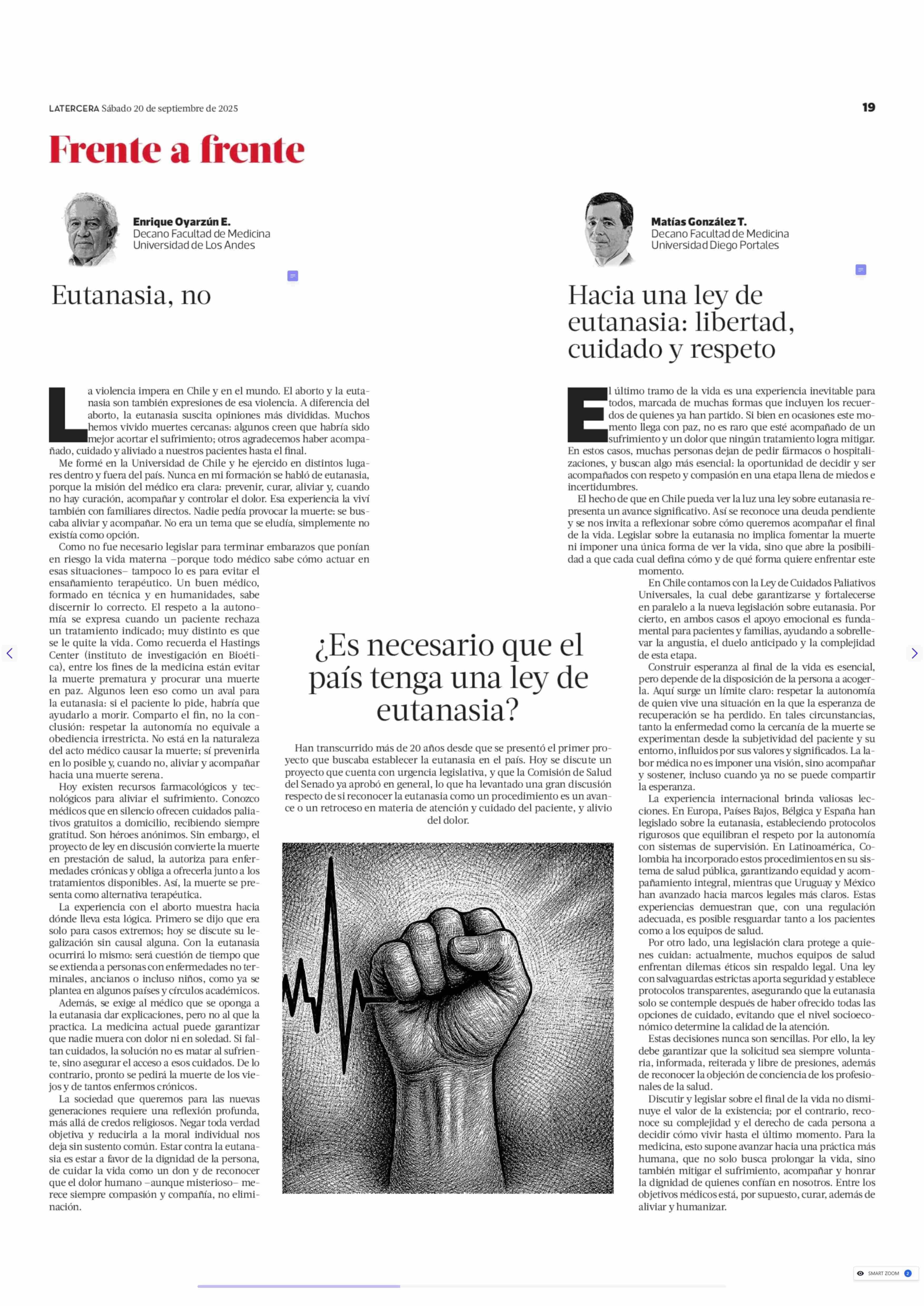 Columnas de Opinión: ¿Es necesario que el país tenga una ley de eutanasia? 20-09-2025 La Tercera |