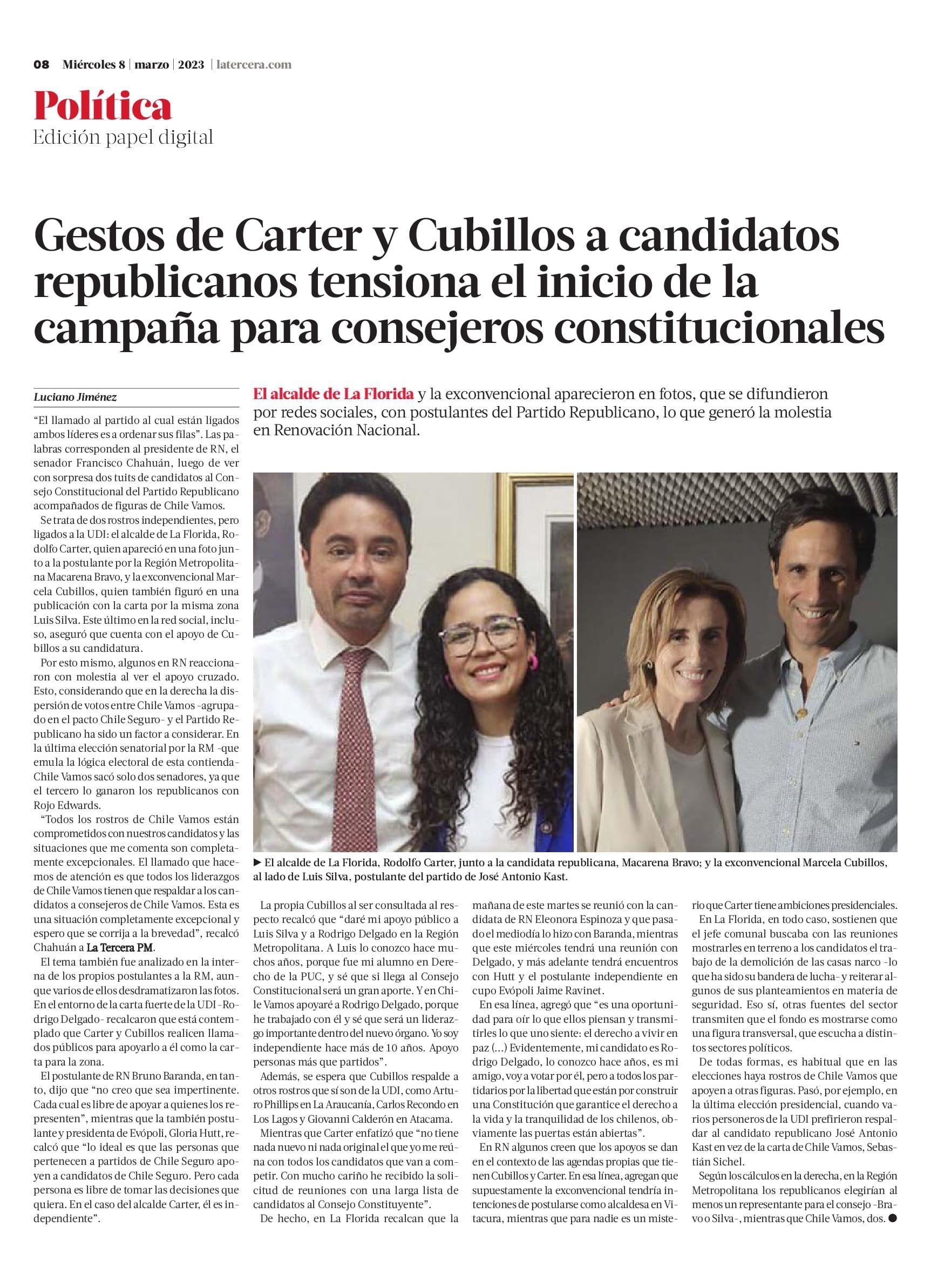 Gestos de Carter y Cubillos a candidatos republicanos tensiona el inicio de la campaña para consejeros constitucionales 08-03-2023 La Tercera |