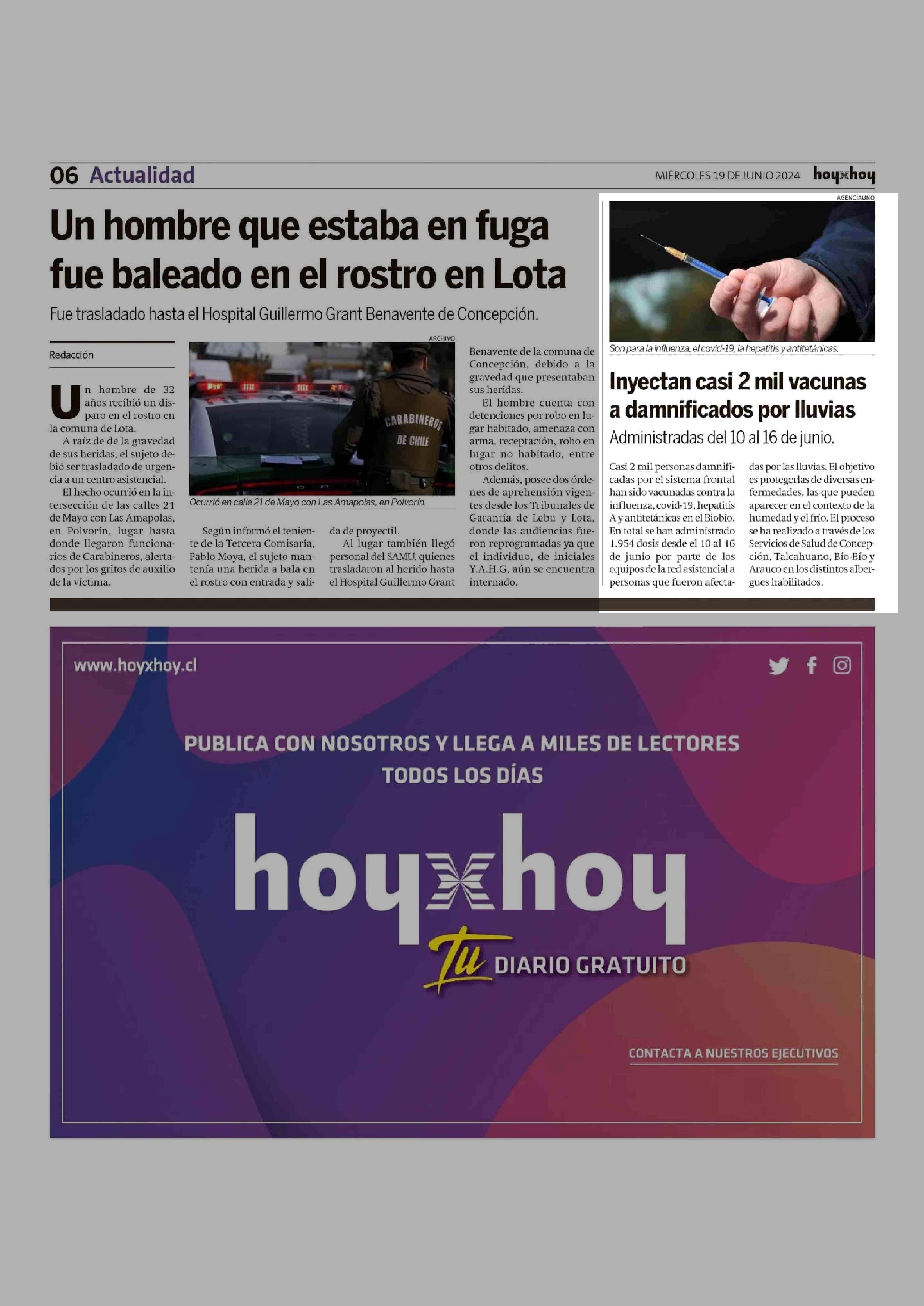 Inyectan casi 2 mil vacunas a damnificados por lluvias 19-06-2024 Hoy x Hoy Concepción |
