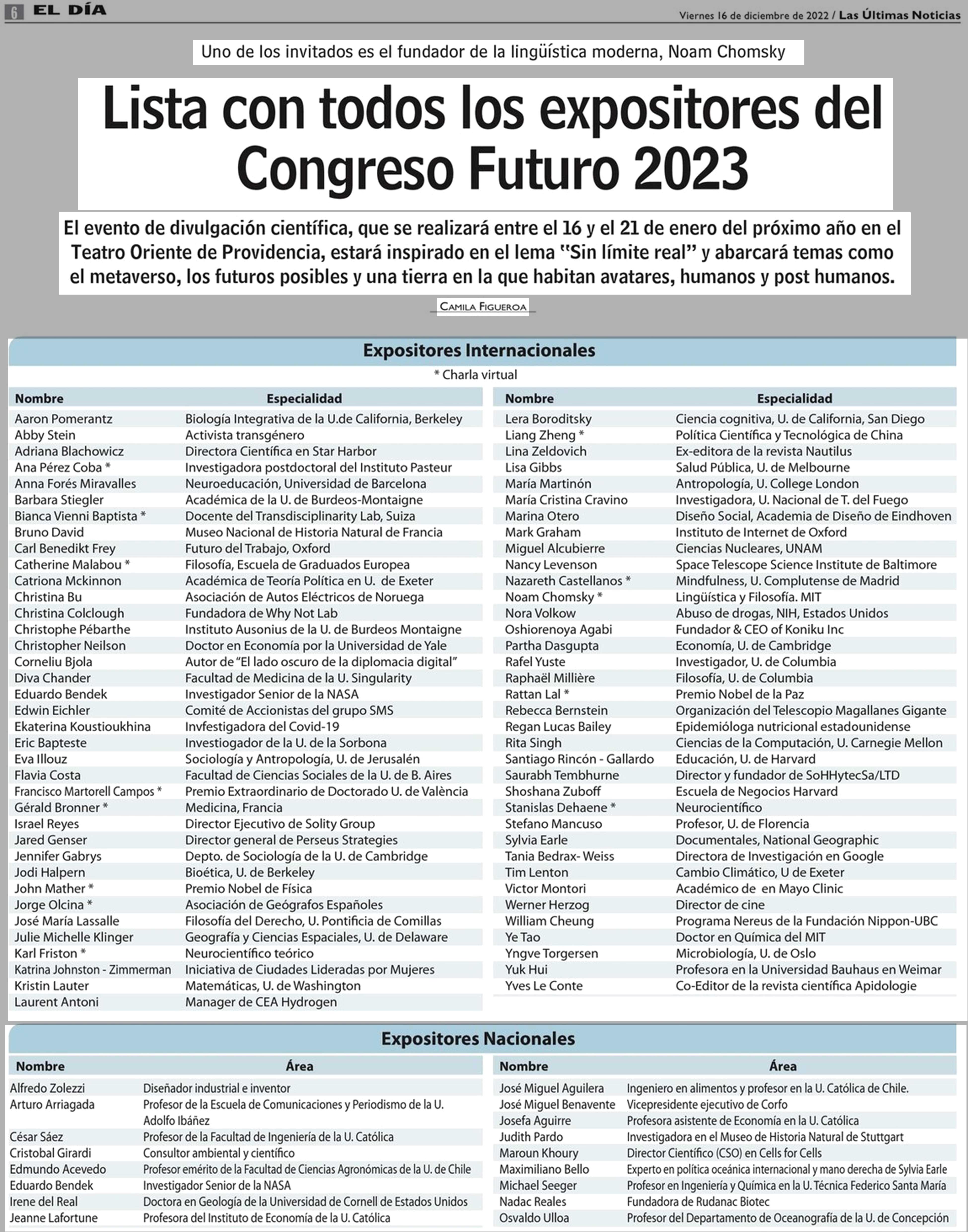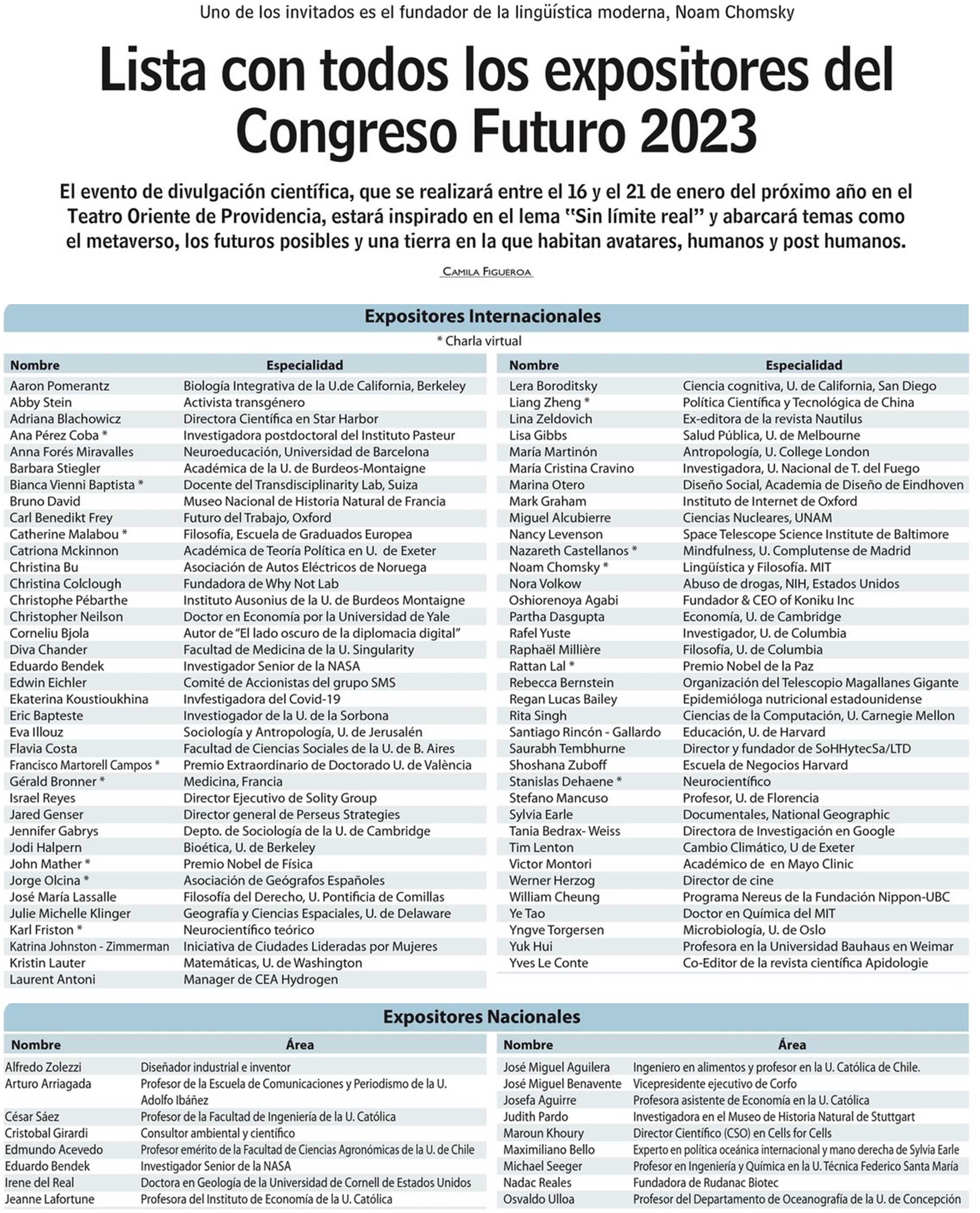 Lista con todos los expositores del Congreso Futuro 2023 16-12-2022 Las Últimas Noticias |