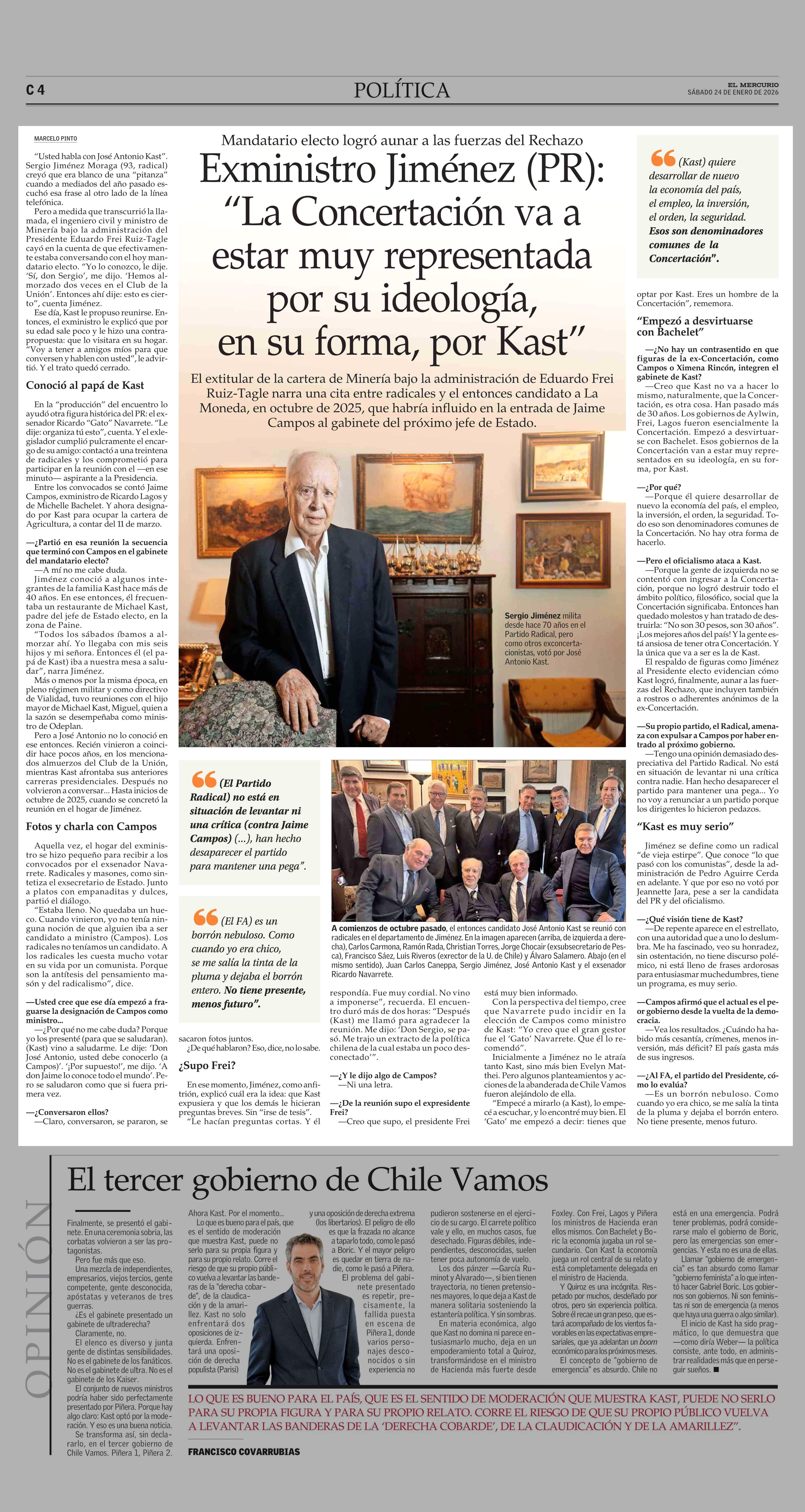 Exministro Jiménez (PR): “La Concertación va a estar muy representada por su ideología, en su forma, por Kast” 24-01-2026 El Mercurio |