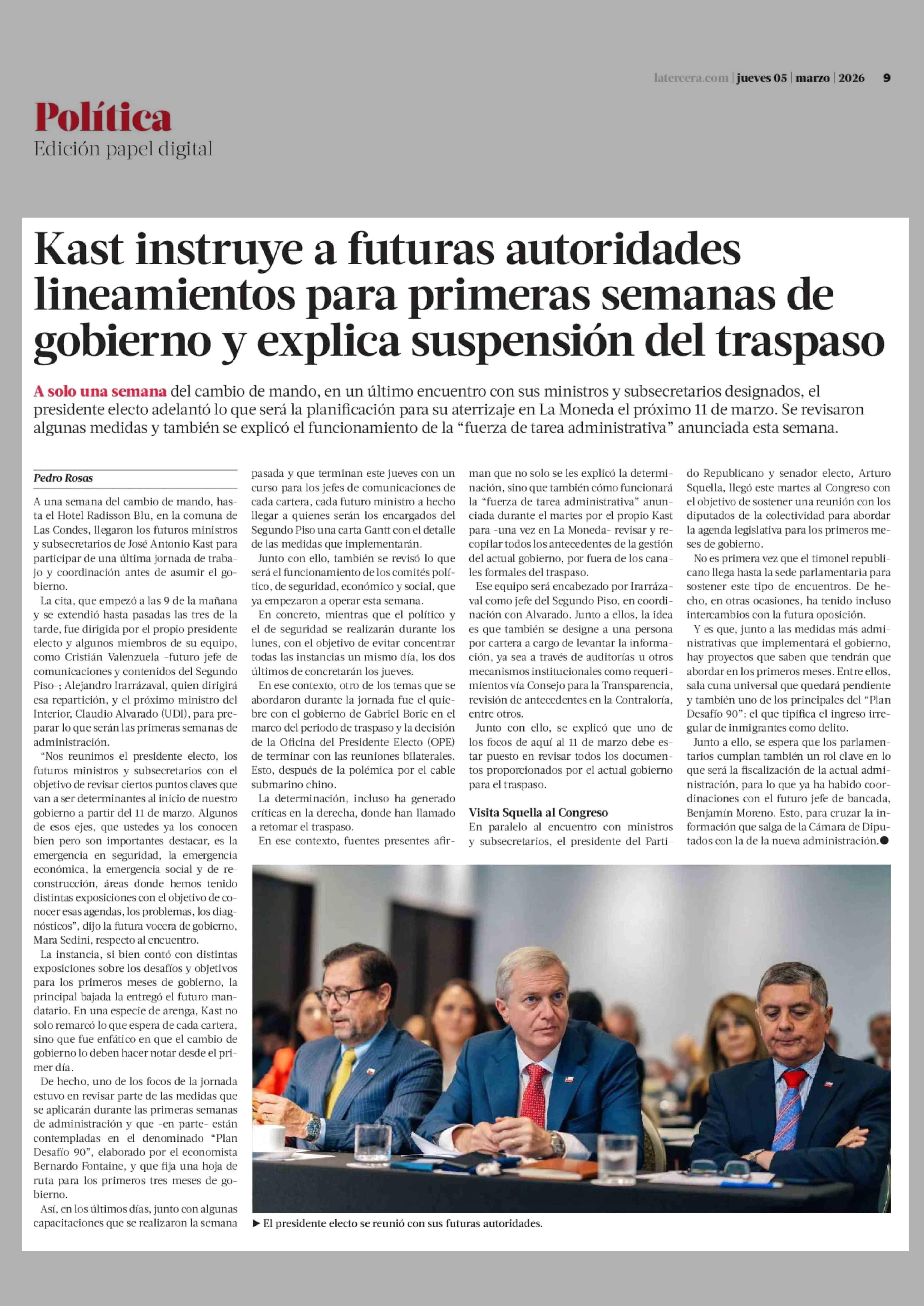 Kast instruye a futuras autoridades lineamientos para primeras semanas de gobierno y explica suspensión del traspaso 05-03-2026 La Tercera |