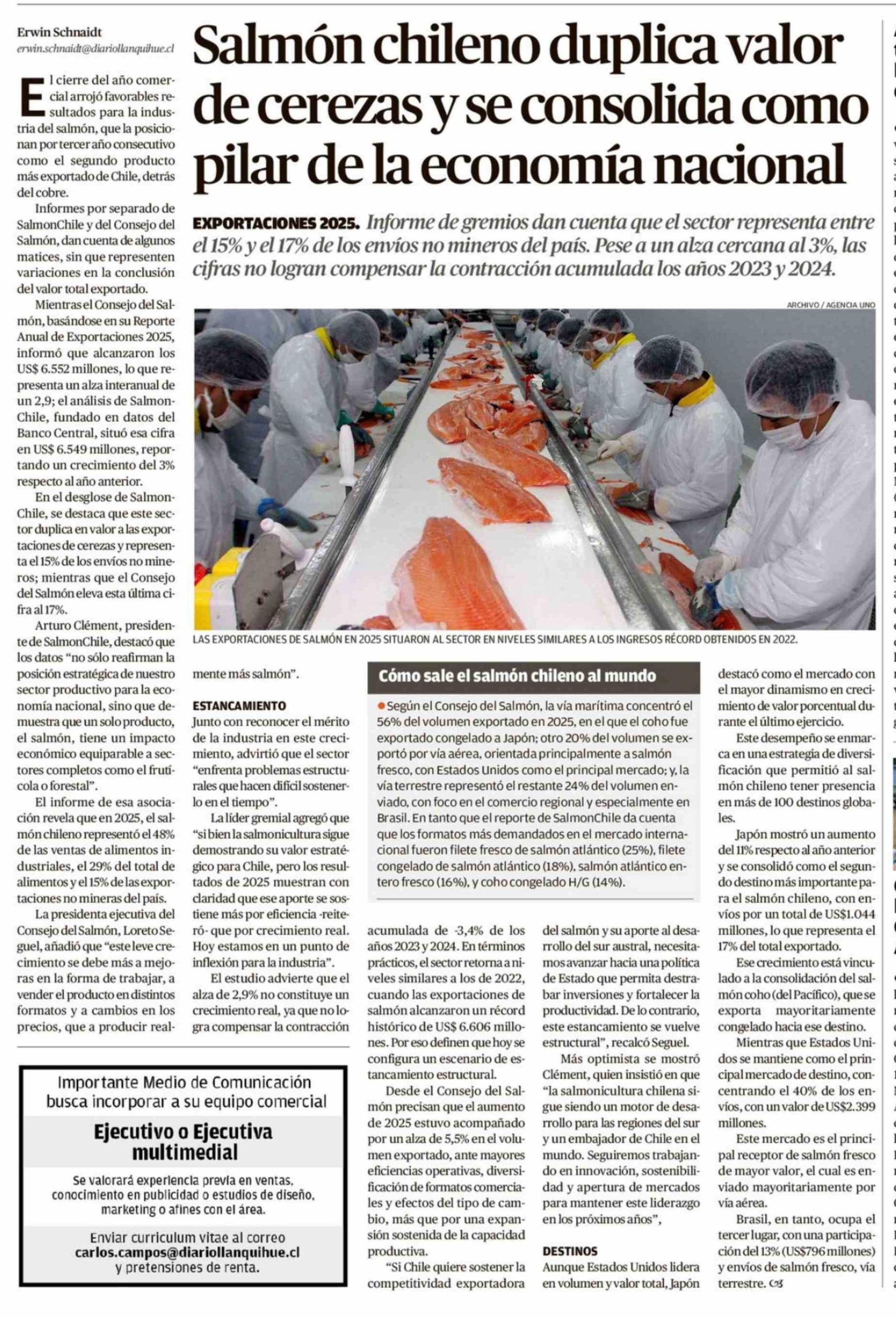 Salmón chileno duplica valor de cerezas y se consolida como pilar de la economía nacional 09-02-2026 El Llanquihue |