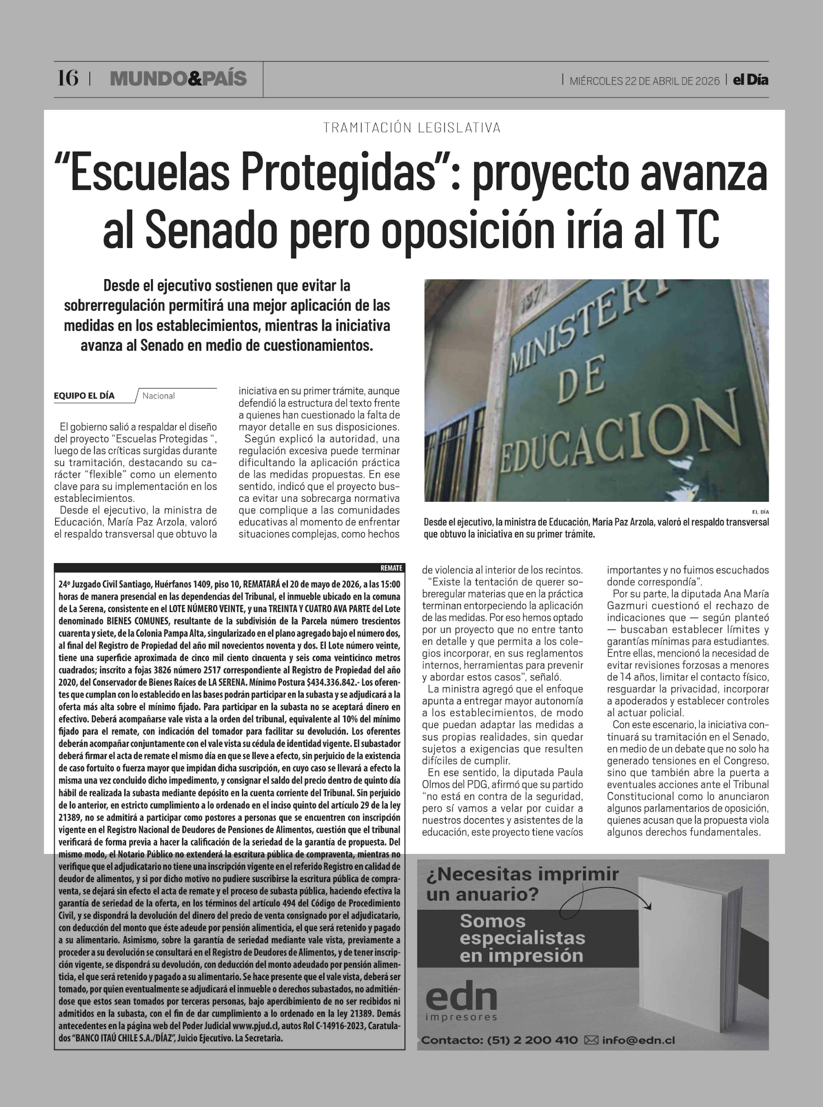"Escuelas Protegidas": proyecto avanza al Senado pero oposición iría al TC 22-04-2026 El Día |